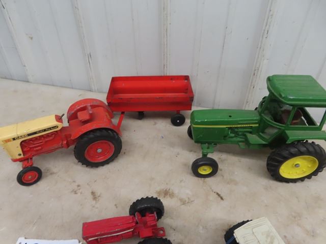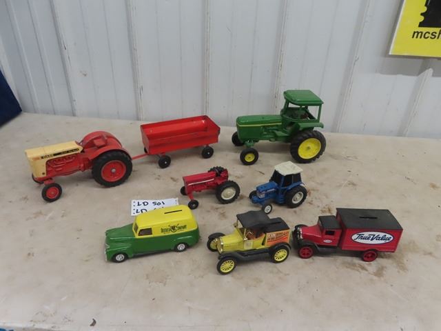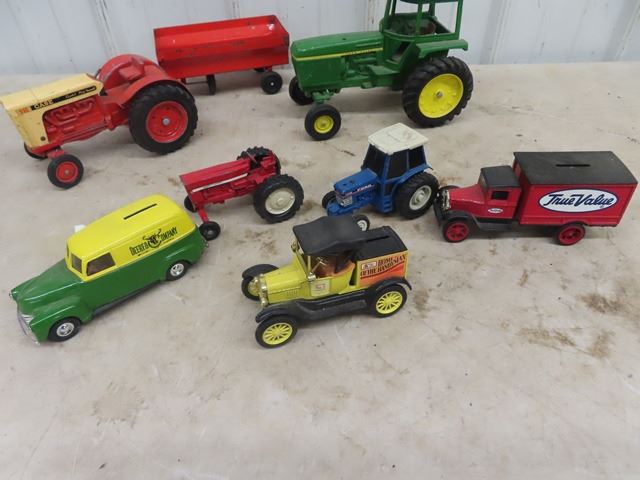 4 Die Cast Tractor & Wagon Case 930 & 3 Vehicle Banks w Adv , Home Hardware , John Deer & True Value