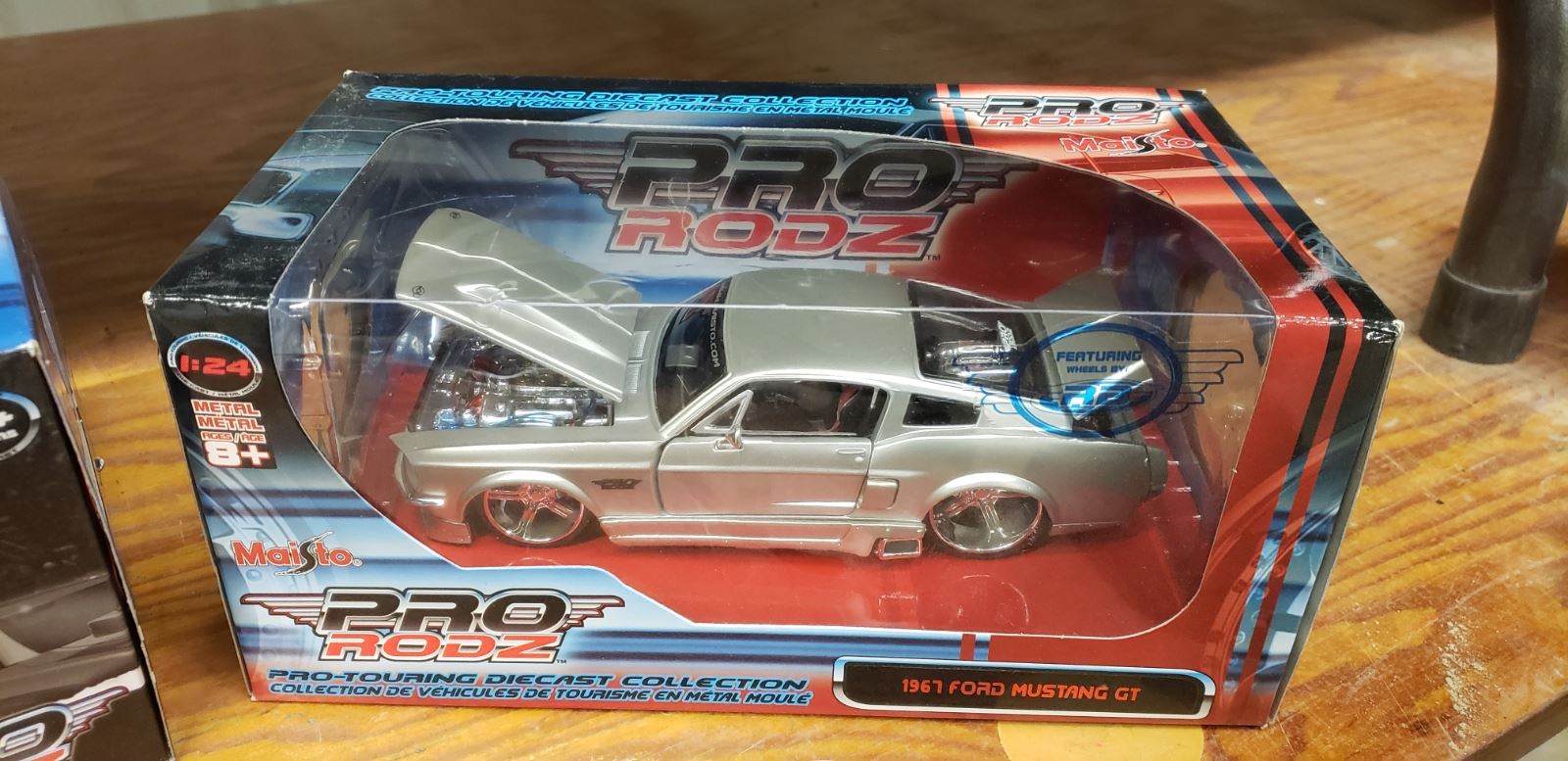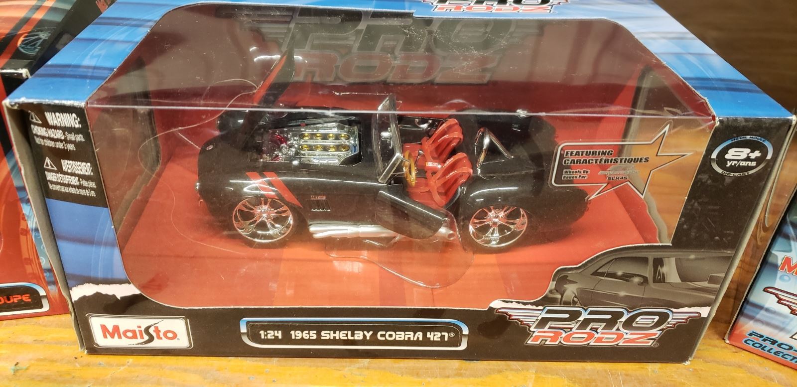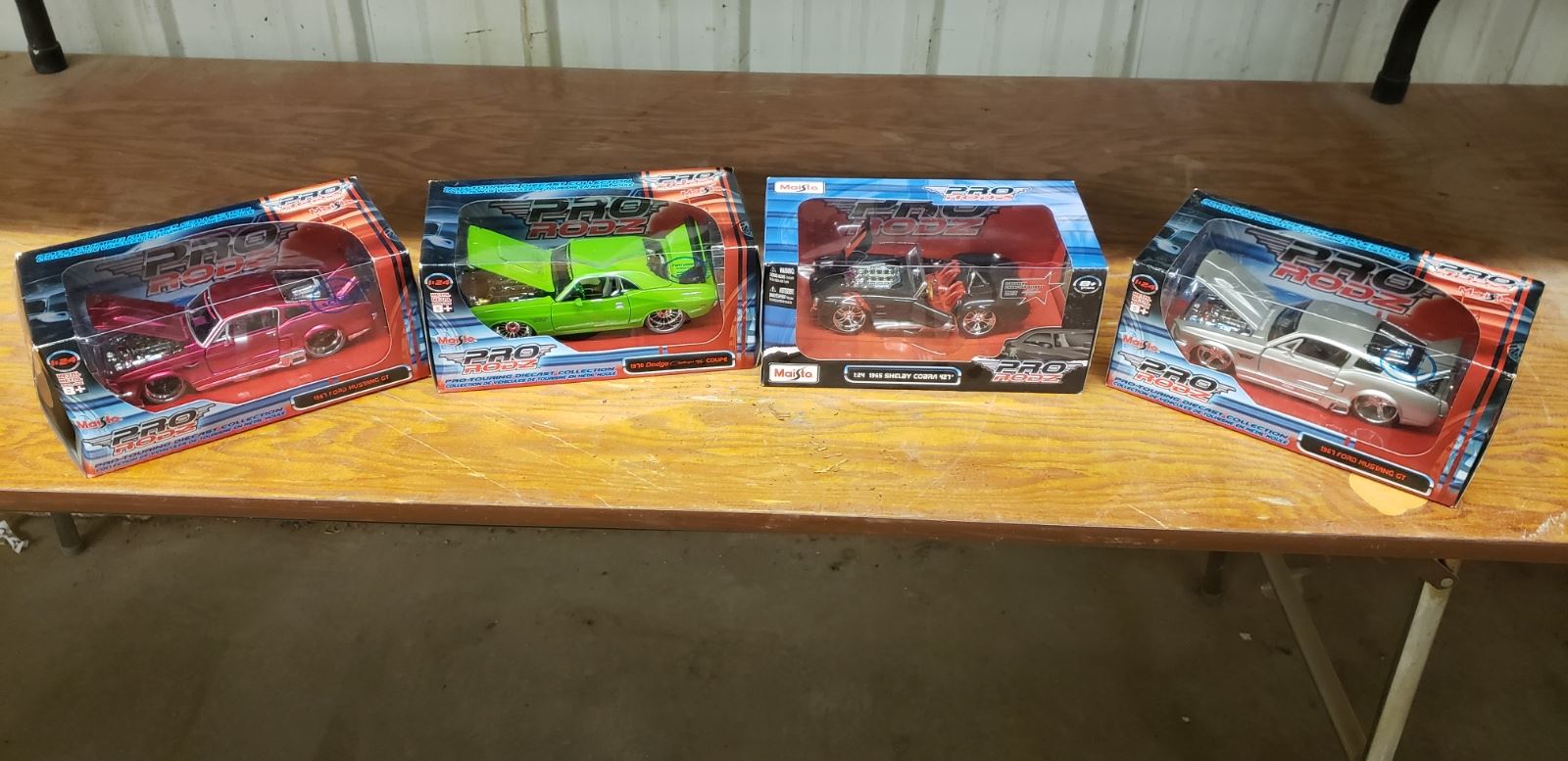 4 Diecast Cars in Boxes Scale 1:24 : 1965 Shelby Cobra , 1970 Dodge Challenger , (2) 1967 Ford Mustang