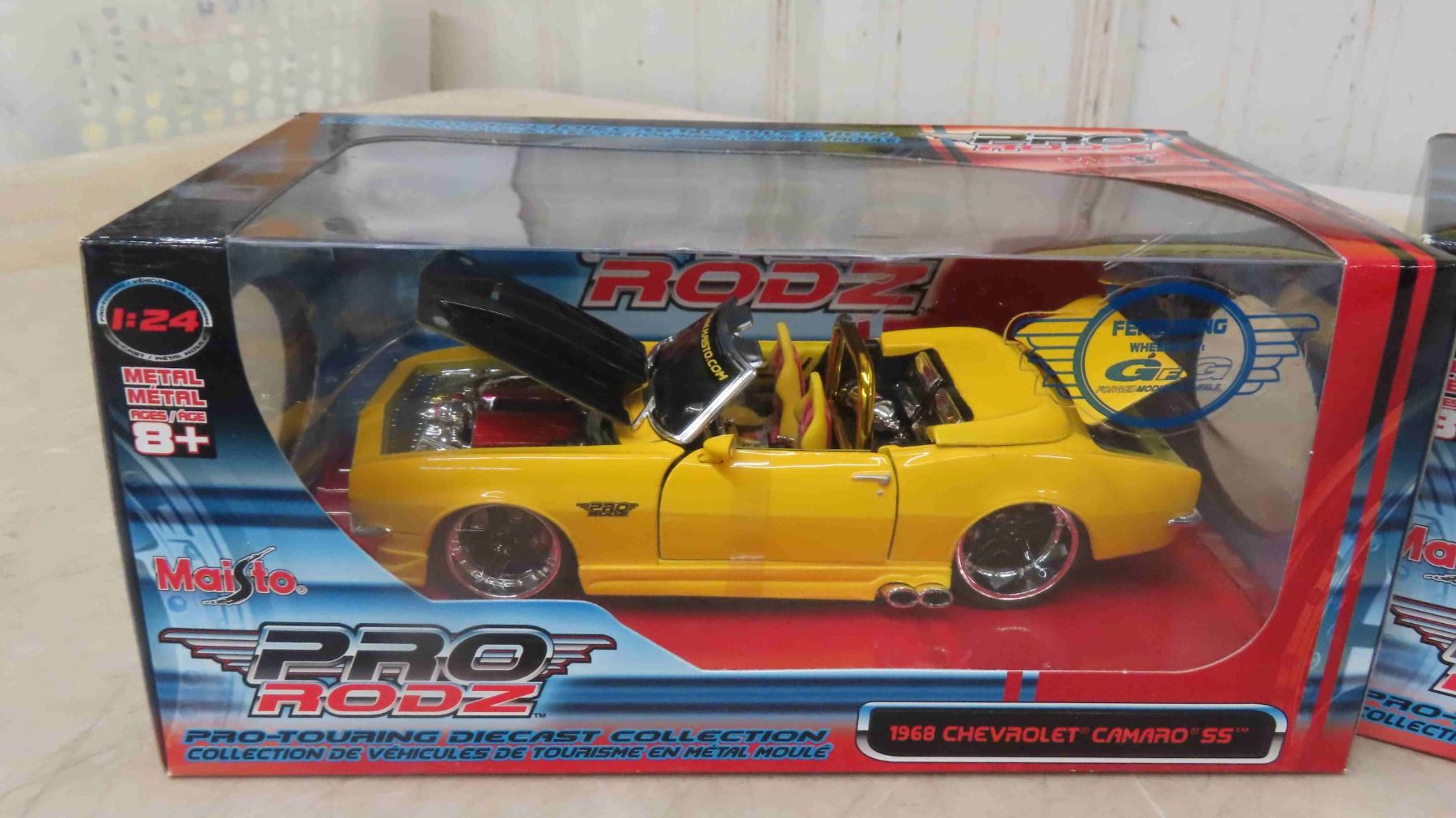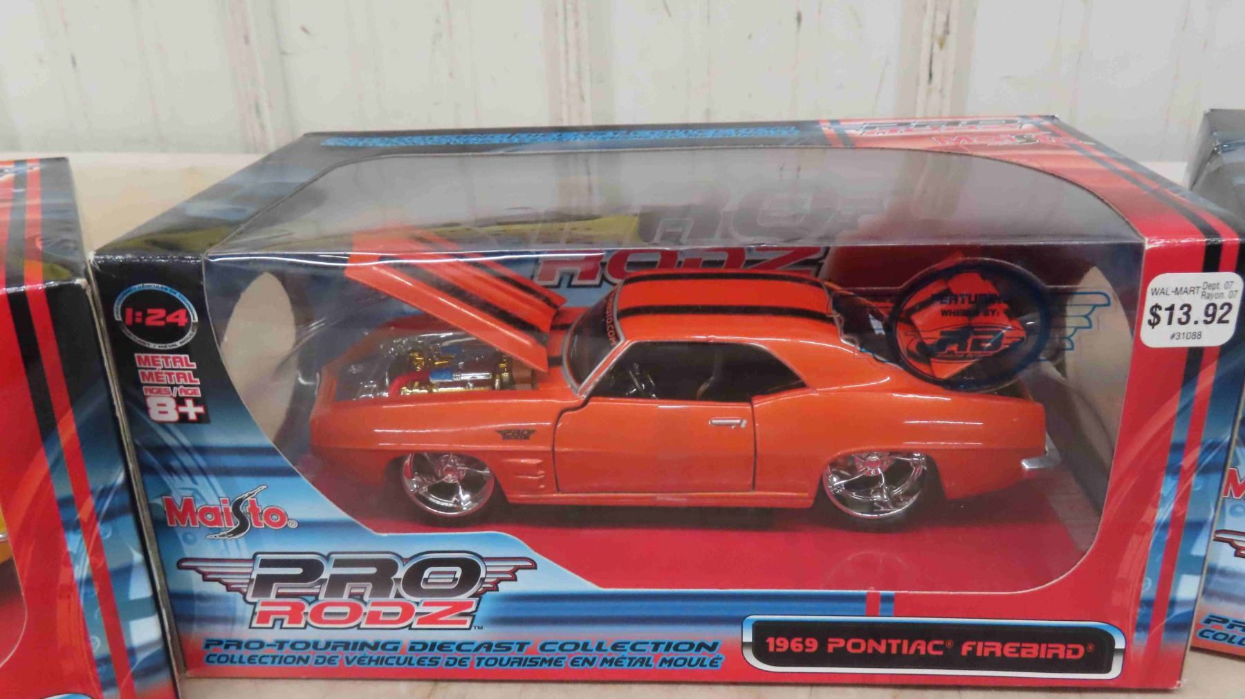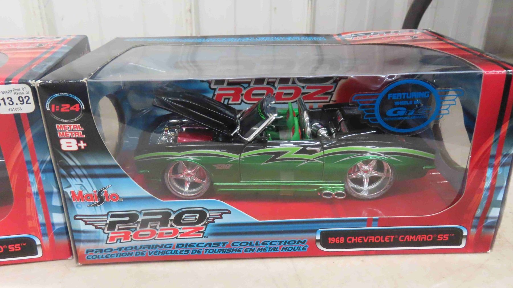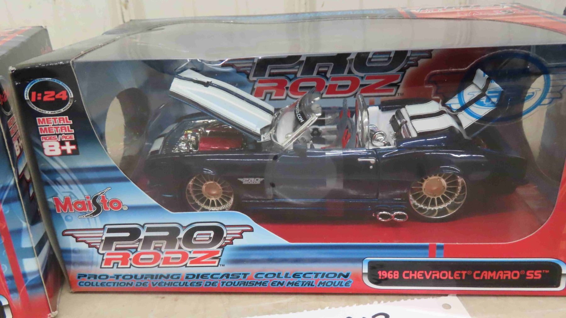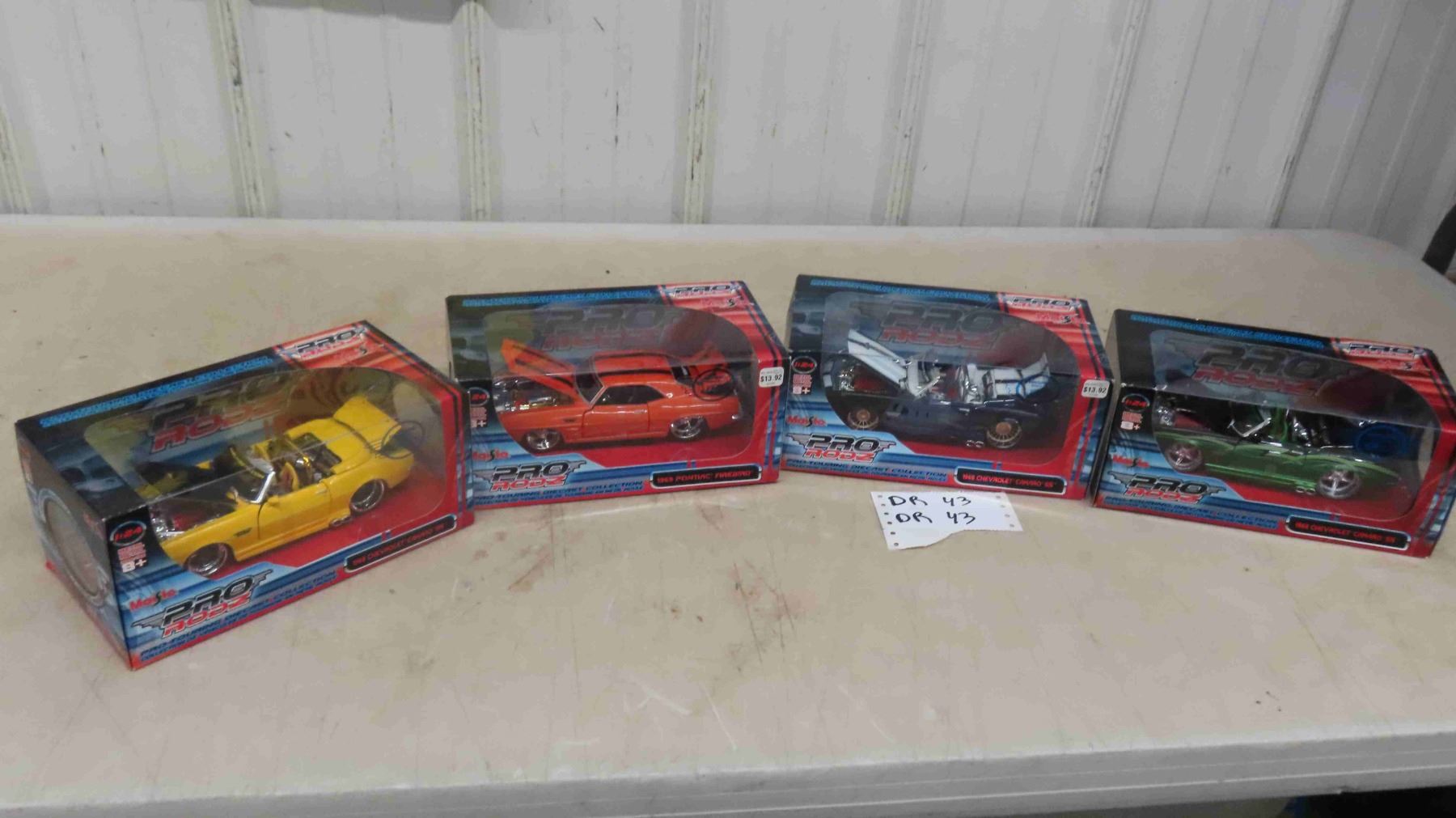 4 Diecast Cars with Boxes Scale 1:24 : 1968 Chevy Camaro , 1969 Pontiac Firebird , (2) 1968 Chevy Camaro