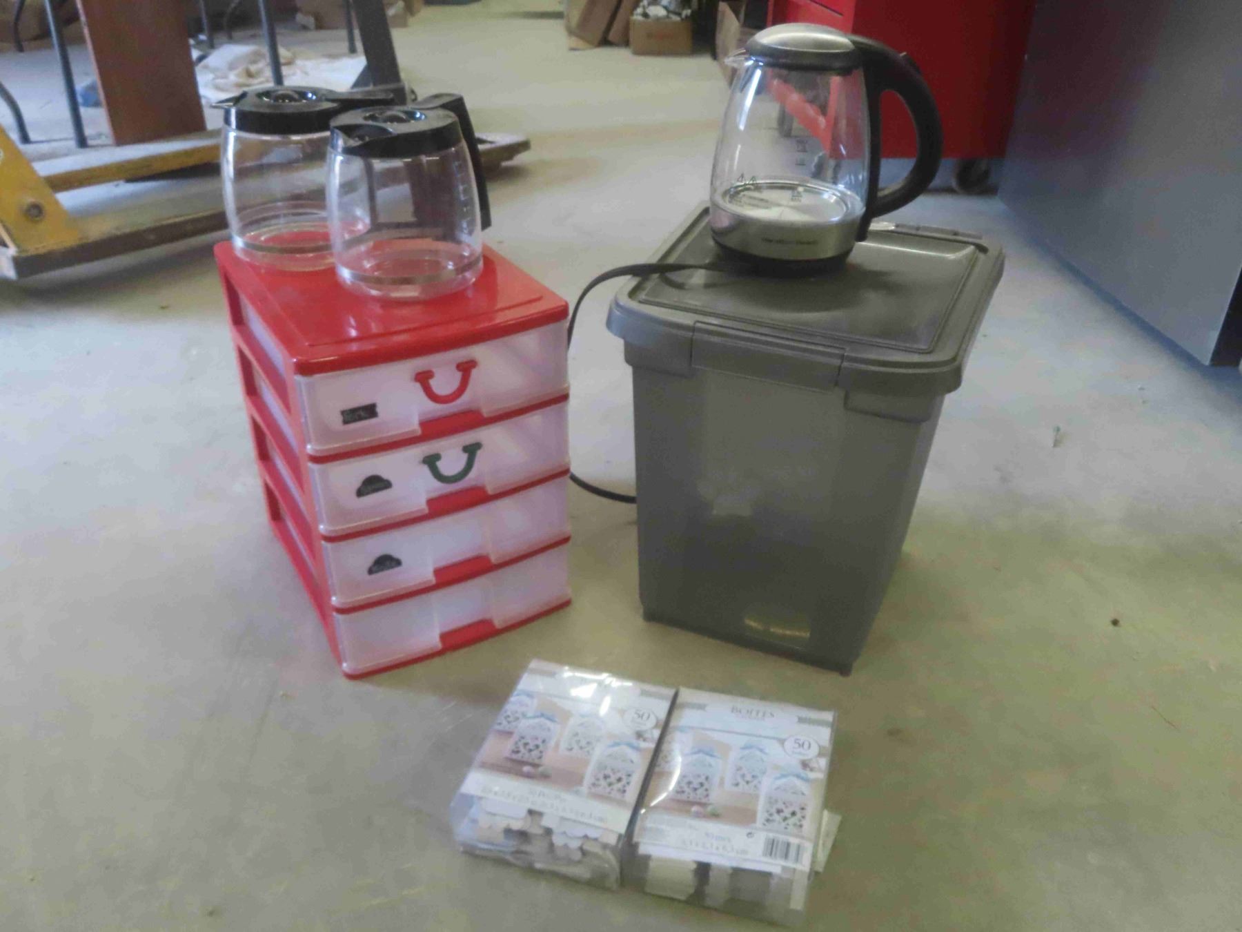 4 Drawer Organizer, Electric Kettle, New Old Stock 2 Packages of Favor Boxes, Plus