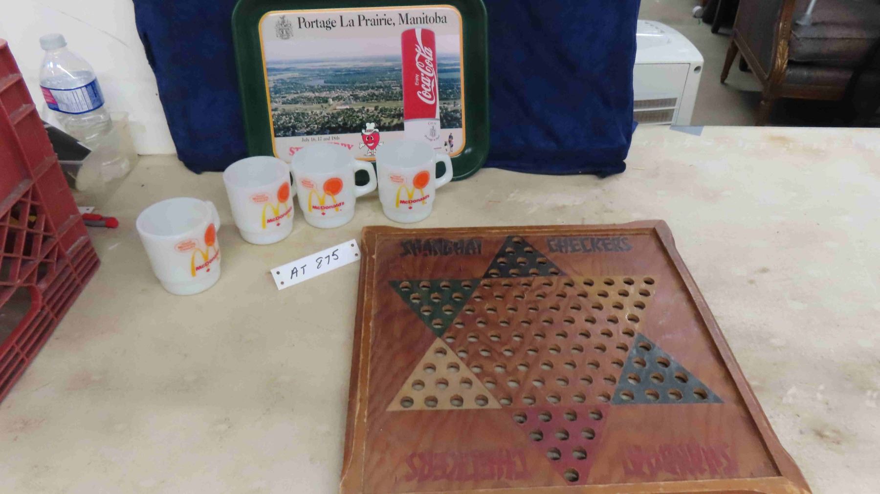 4 Fire King / McDonalds Coffee Mugs, Portage La Prairie Coca-Cola Tray, Shanghai Checker Board