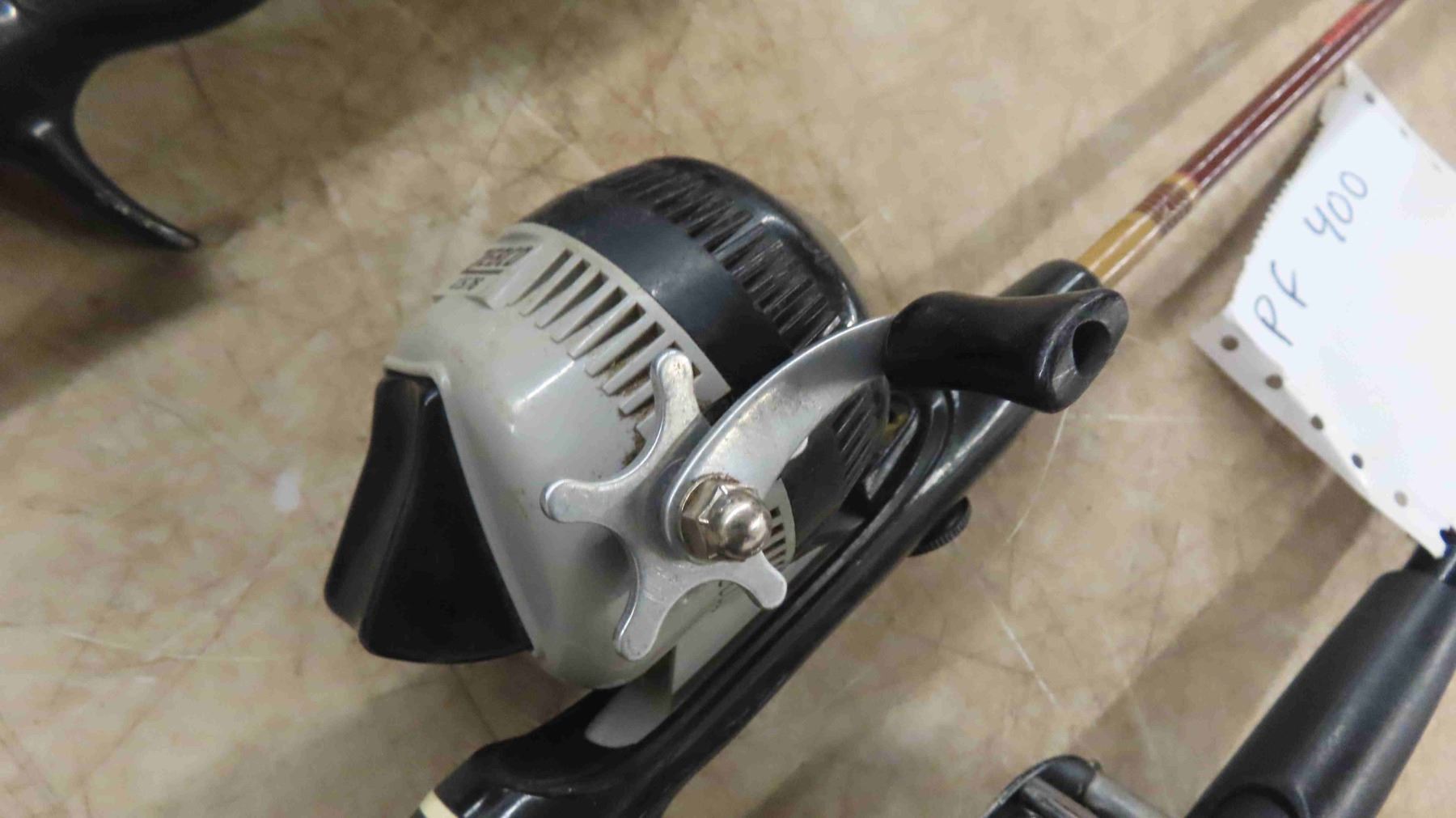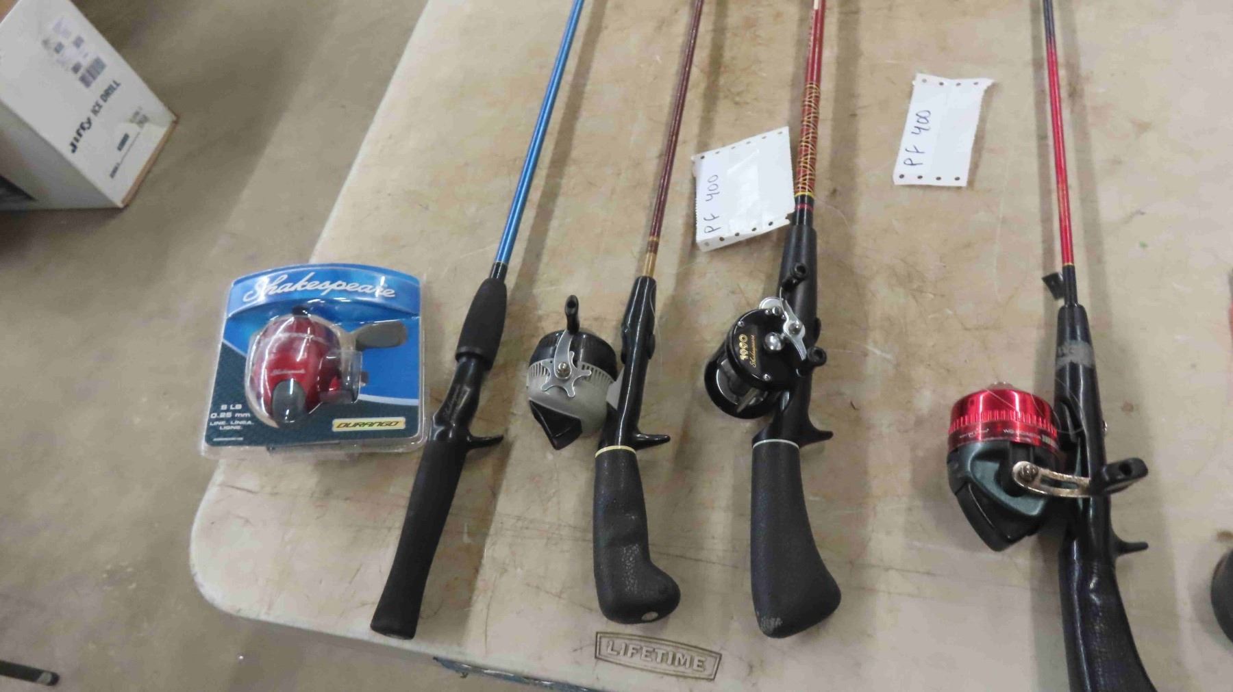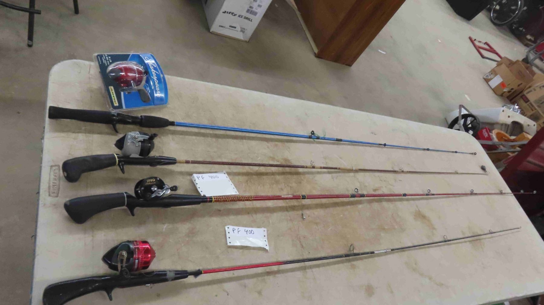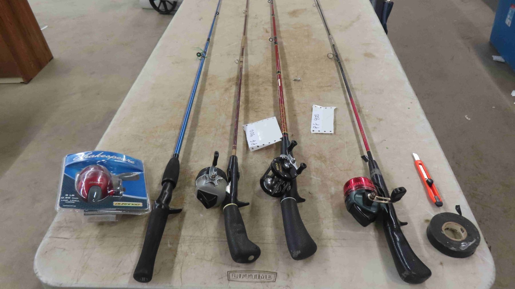 4 Fishing Rods + Reels ; Shakespeare, Zebco, Worm Gear