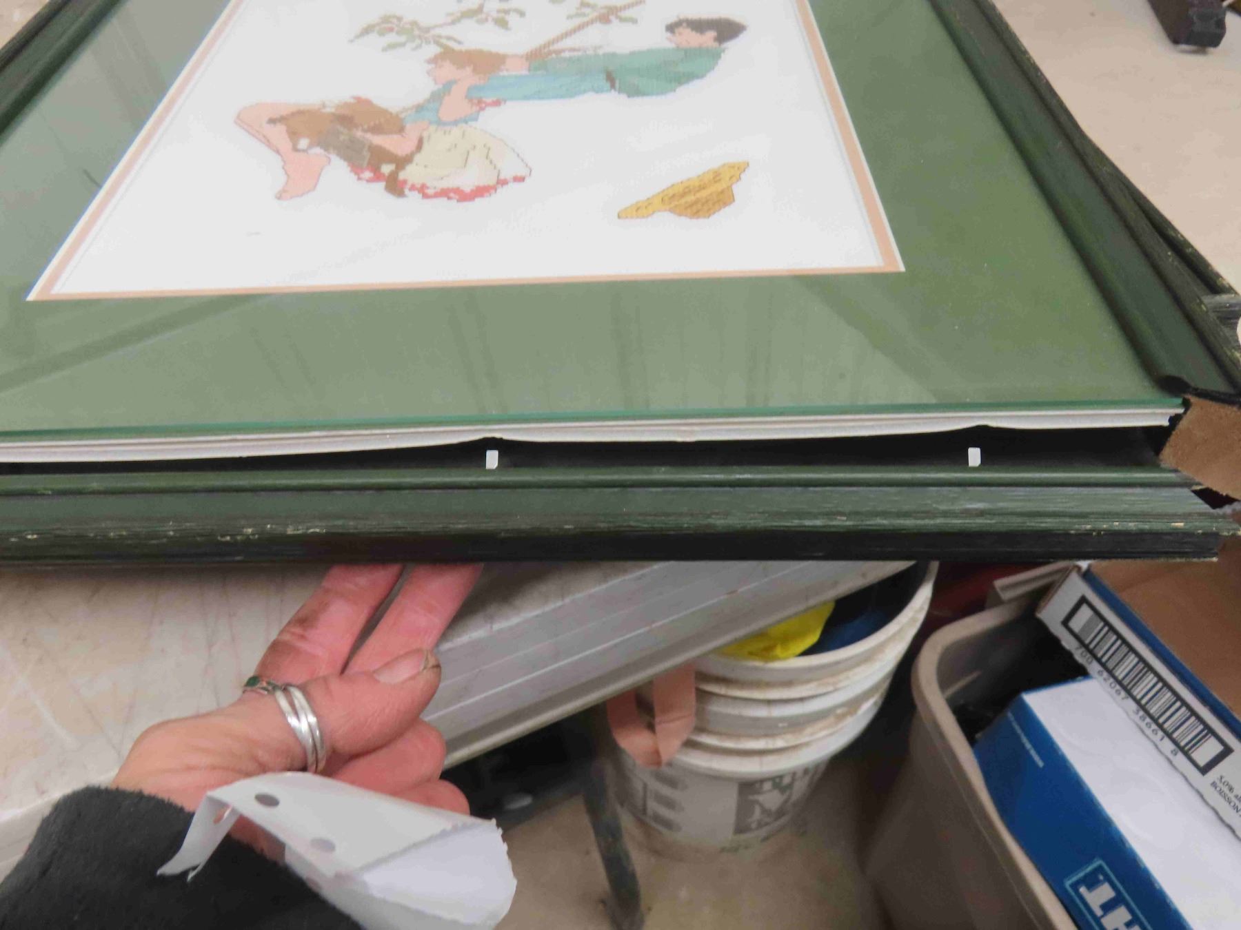 4 Framed Petti Point Pictures 17" x 17" - 1 picture frame needs TLC
