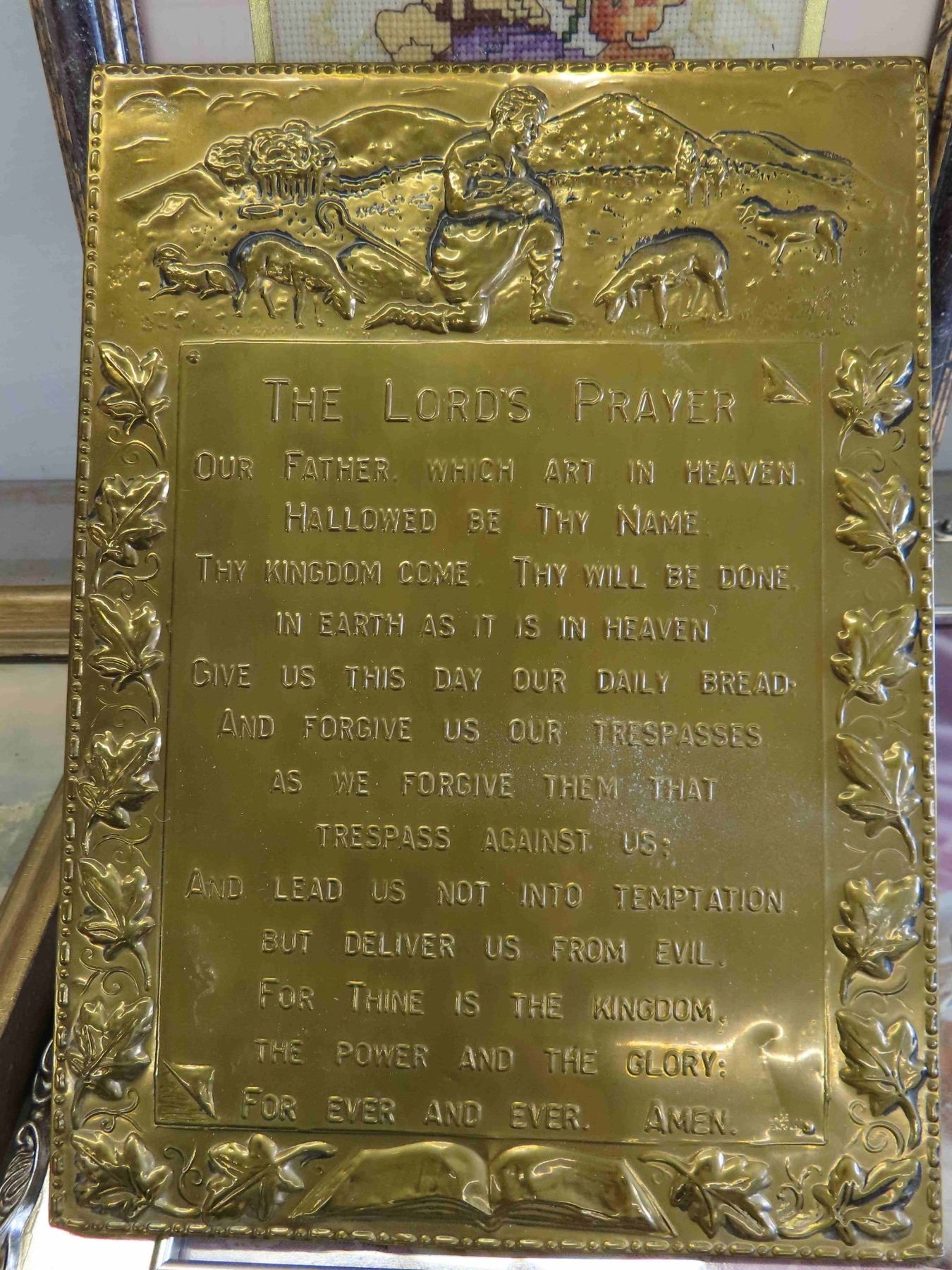 4 Framed Pictures : Needle Point , Brass Plaque with Lords Prayer & More