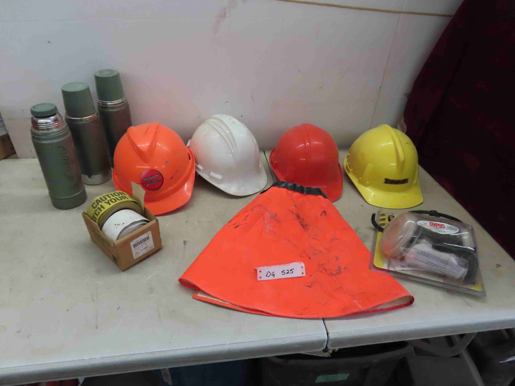 4 Hard Hats, Caution Tape, New Dual Cartridge Respirator, 3 Thermos's & More