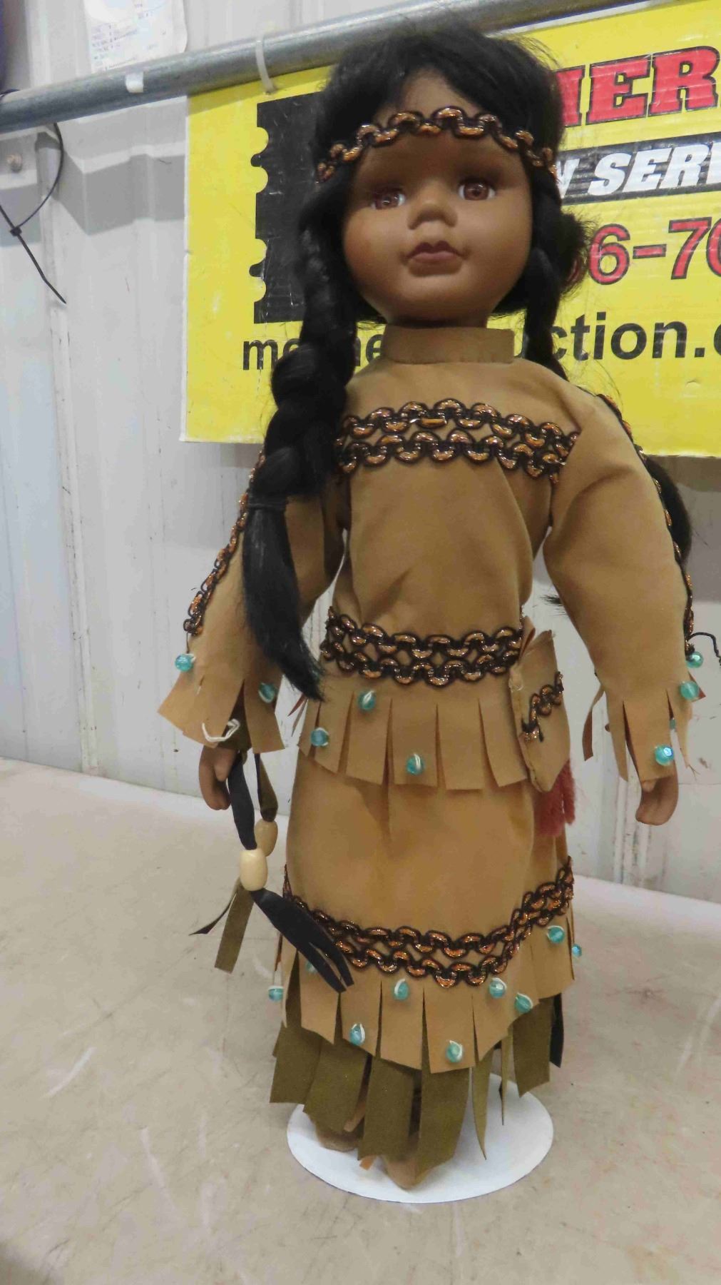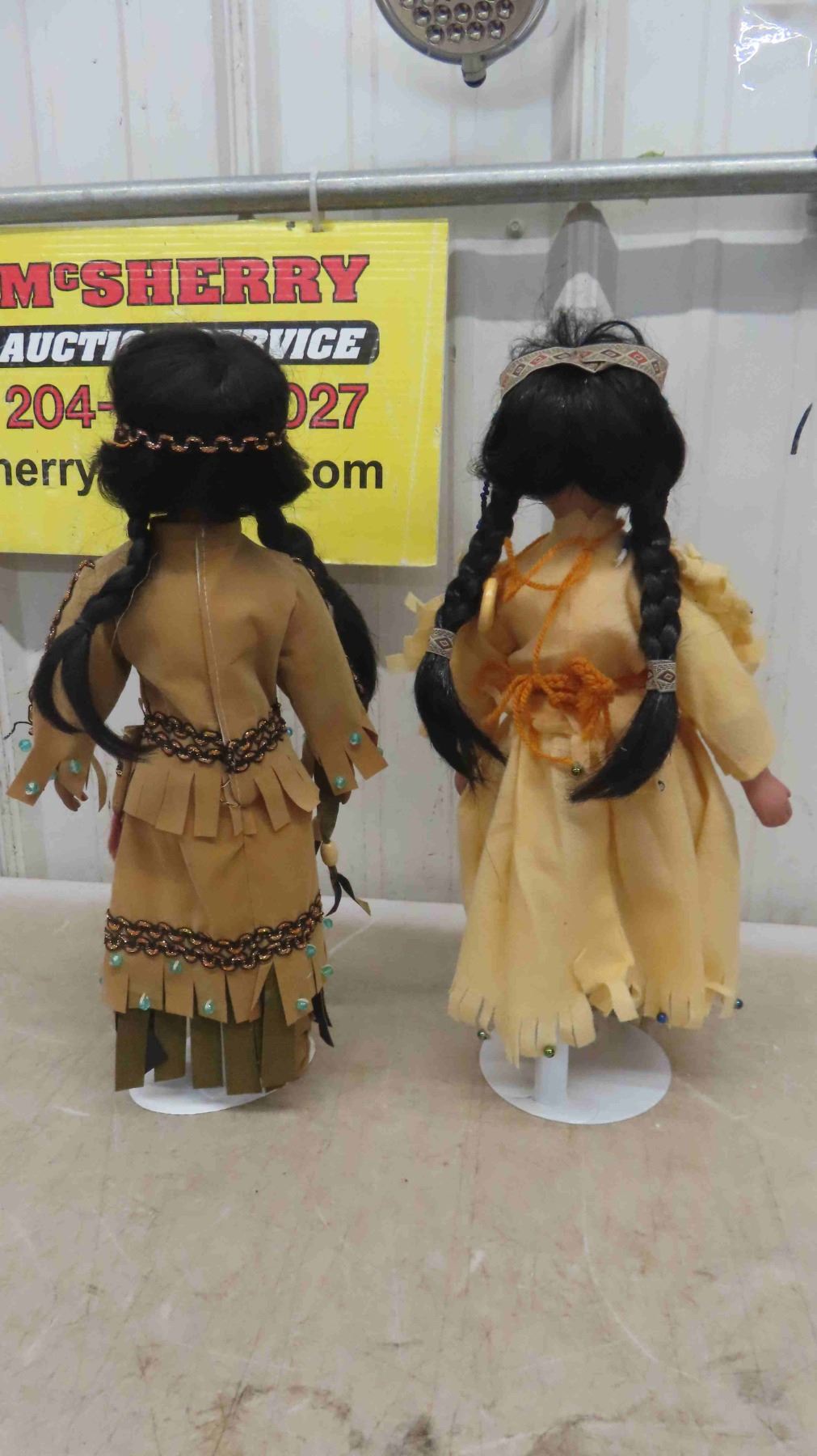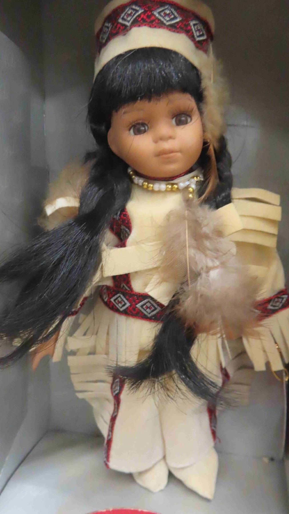 4 Indigenous Dolls: (2) 16'' Porcelain with Stands , (1) 8'' Porcelain In Its Box Stand, (1) 8.5'' Plastic in Suede Outfit with Eyes that Open and Close