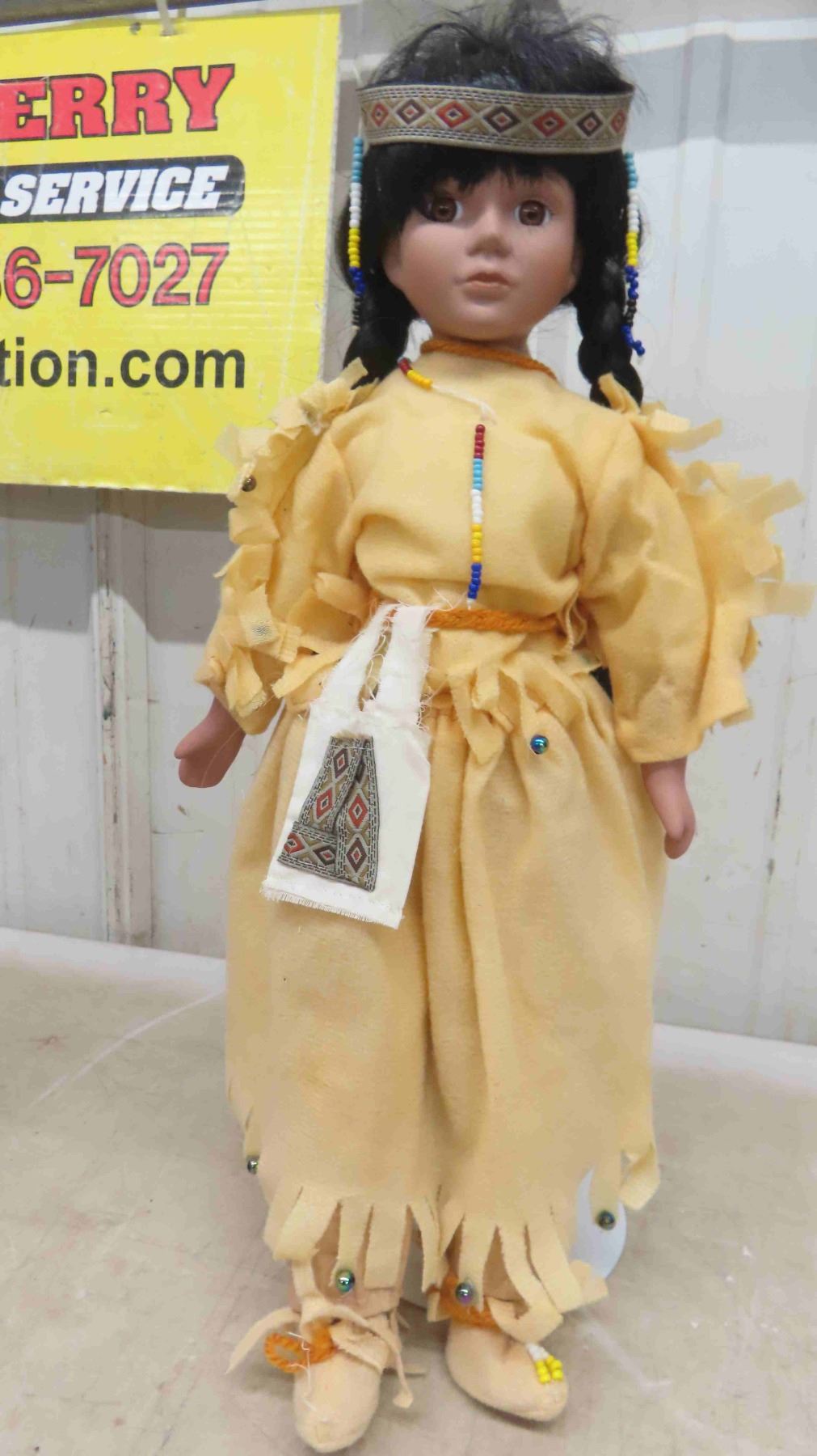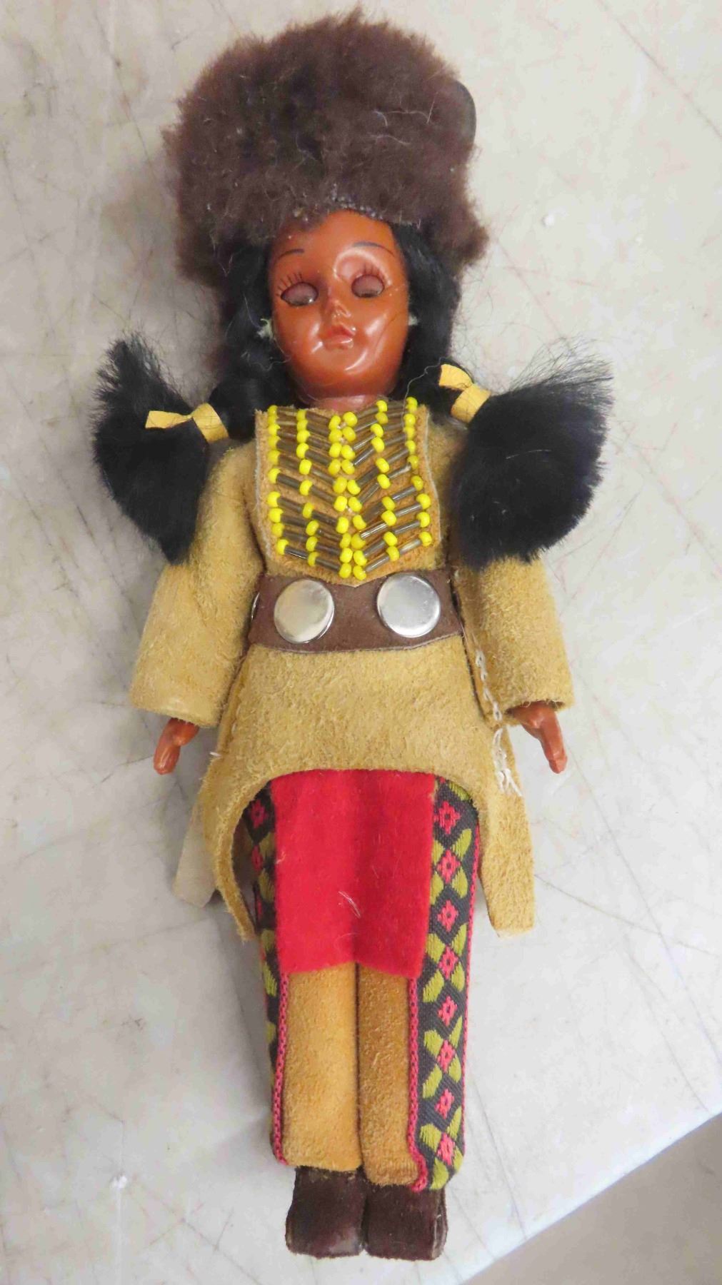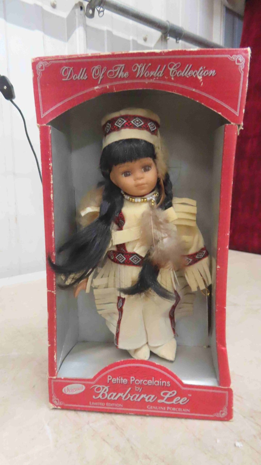 4 Indigenous Dolls: (2) 16'' Porcelain with Stands , (1) 8'' Porcelain In Its Box Stand, (1) 8.5'' Plastic in Suede Outfit with Eyes that Open and Close