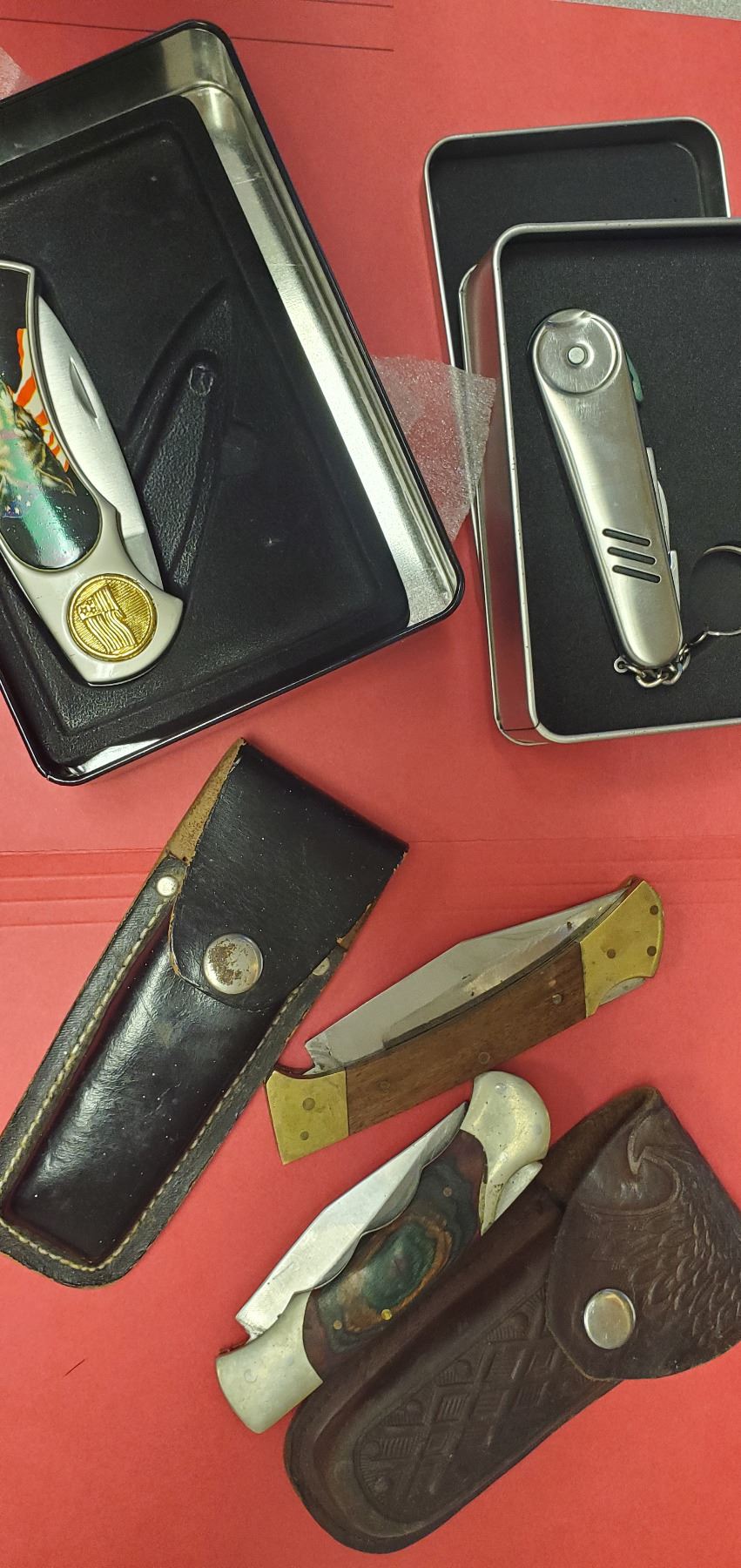 4 Knives - 2 Buck Knives w Sheaths/Cases, 1 Collectors Knife (Wolf) w Case & Multi Knife w case