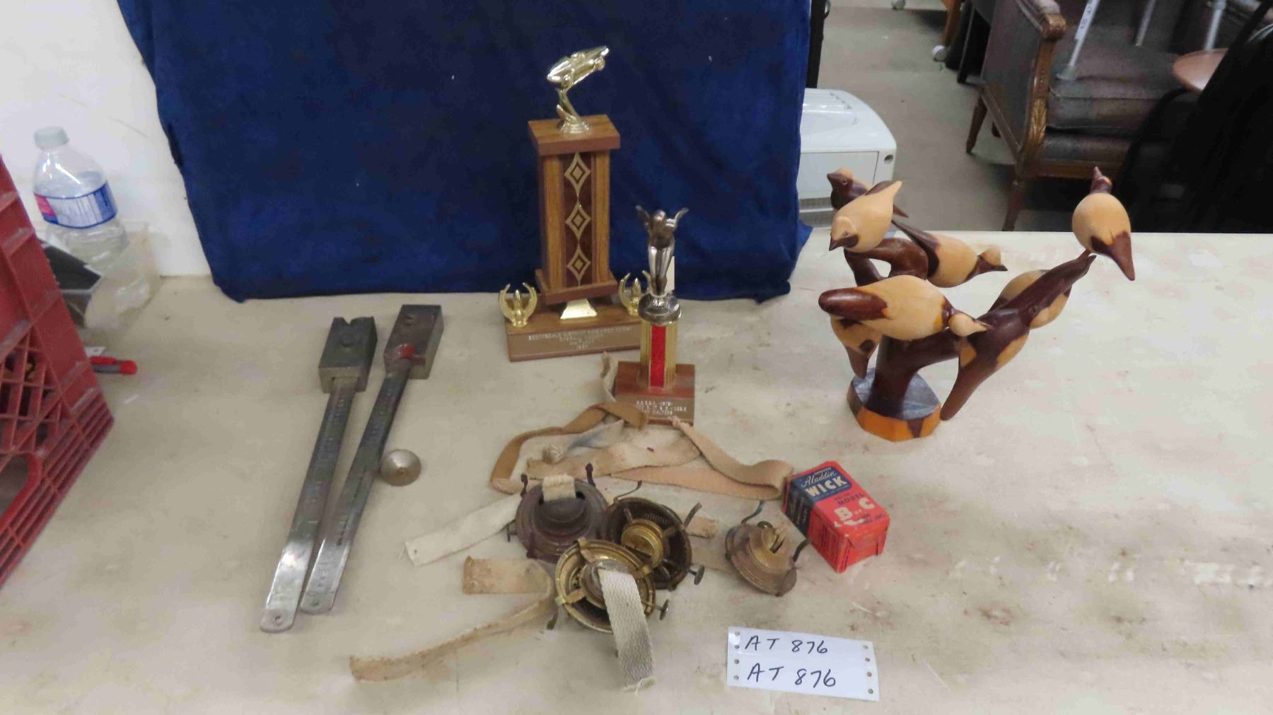 4 Lantern Burners + Box of Wicks, Wood Carving of Birds on Branch, Metal Scale Parts, 2 Trophies
