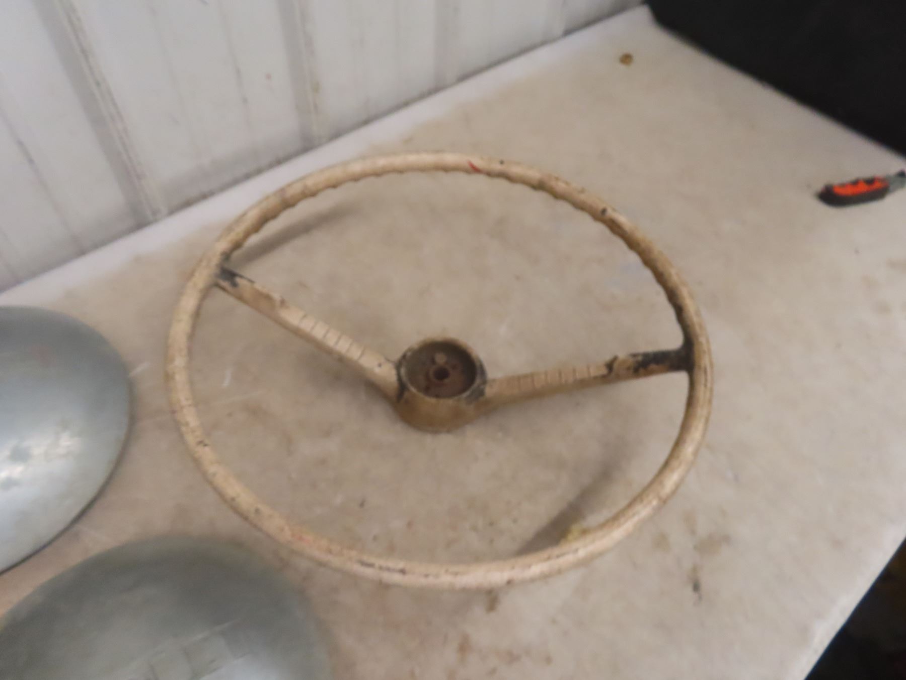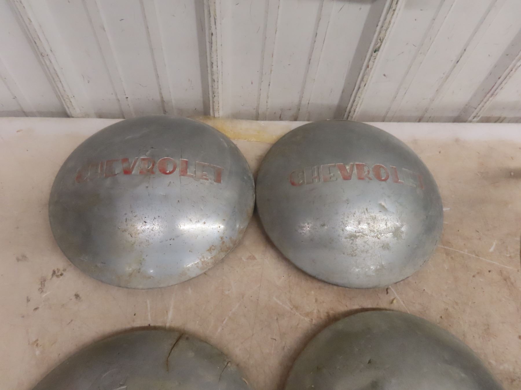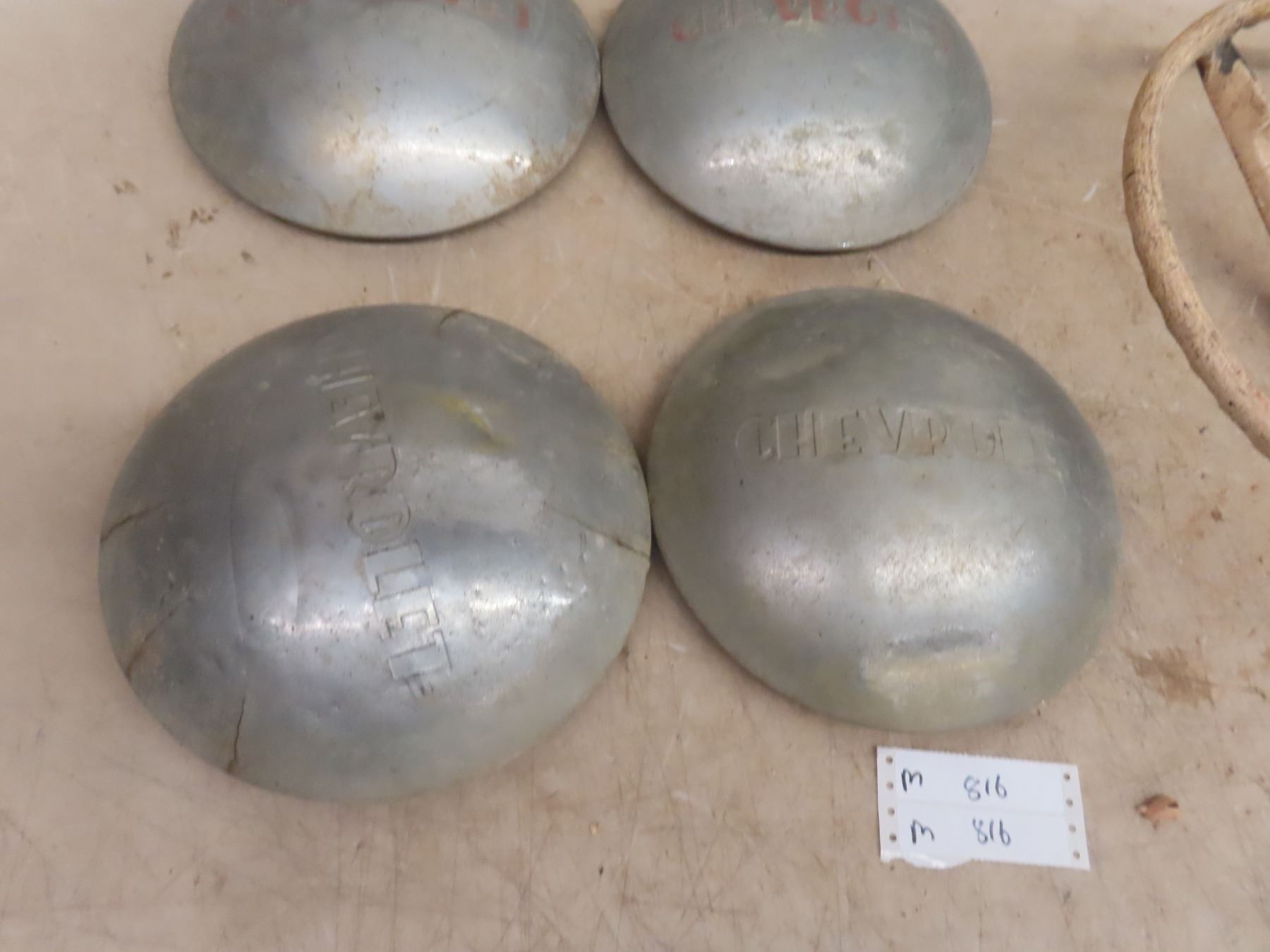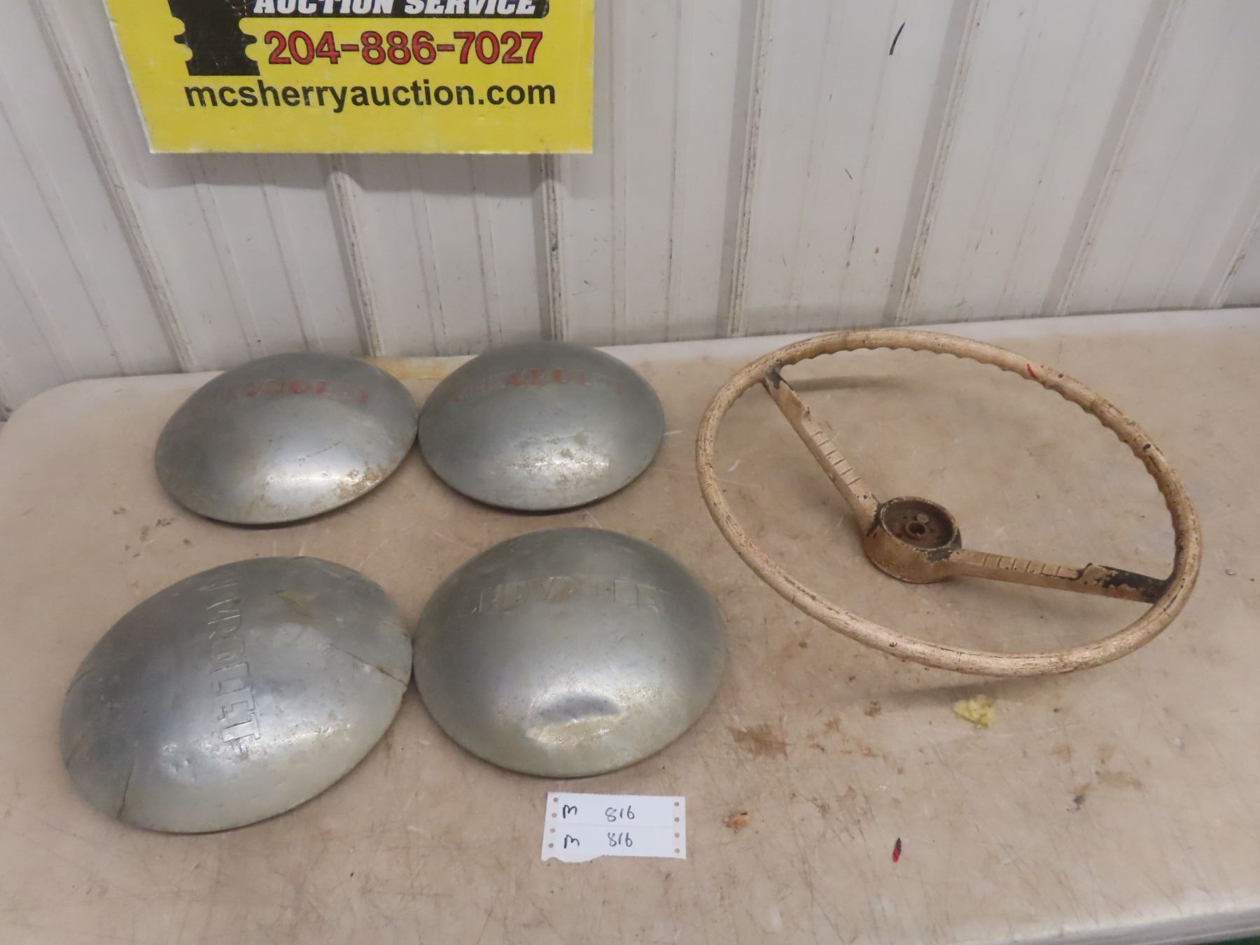 4 Matching Chevy Vintage Hub Caps + Steering Wheel
