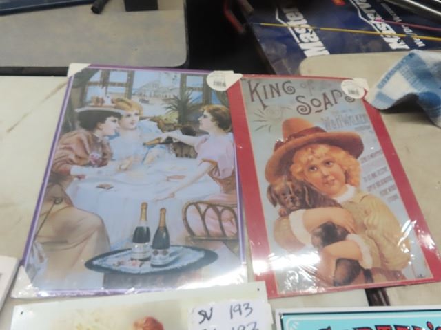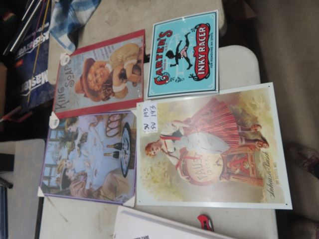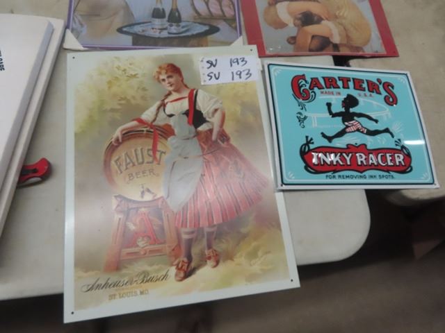 4 Metal Modern Signs; Faust Beer, Diamond Wine, King Soap, Inky Racer