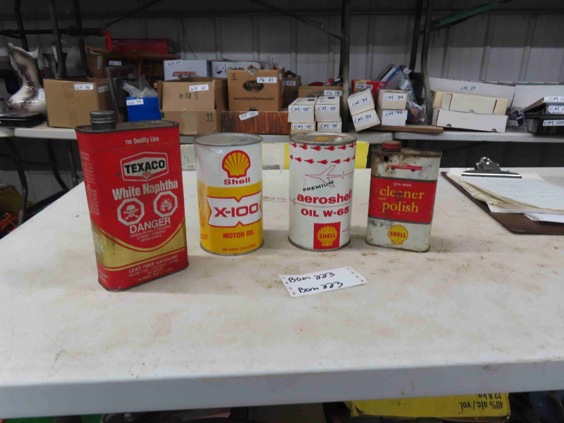 4 Oil Cans ; Shell X-100 Quart with Product, Shell Aeroshell Quart with Product, Texaco Naphtha, Shell Polish