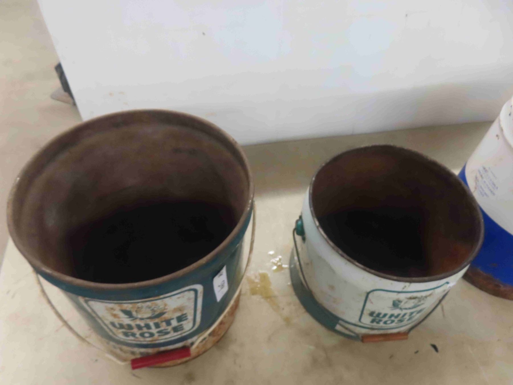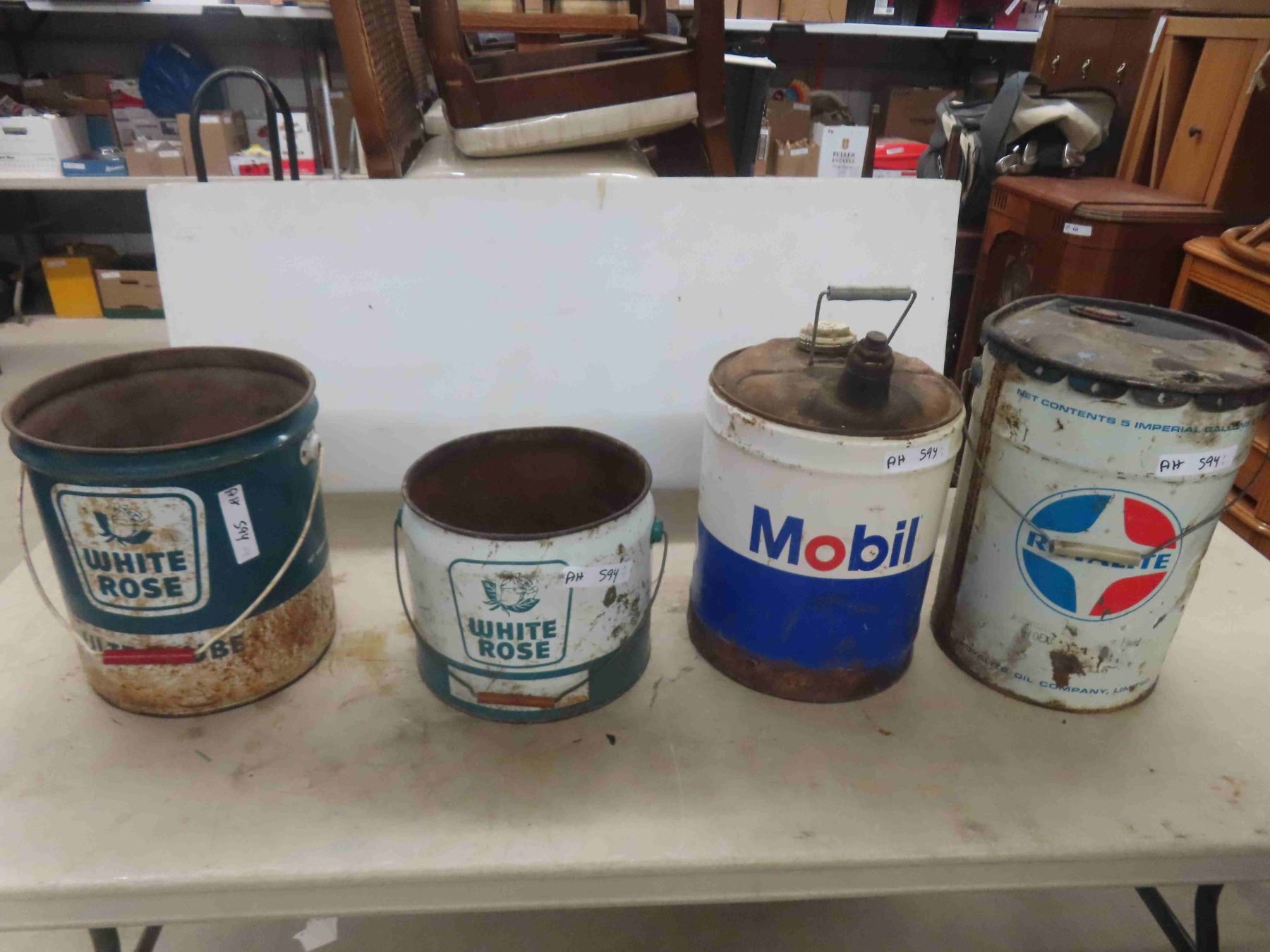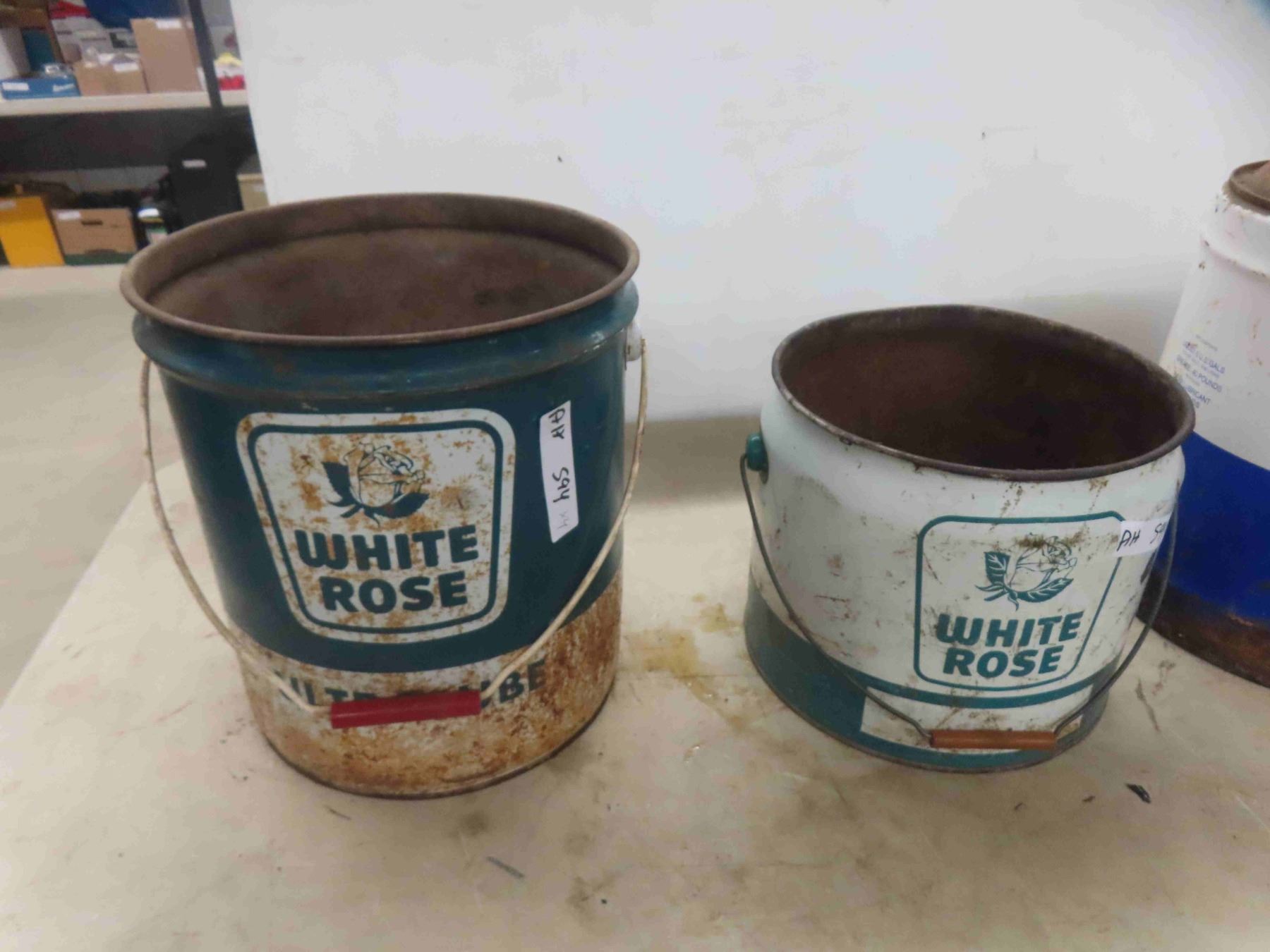 4 Oil/Grease Pails : 2 White Rose 35lbs + 25lbs , Mobil 5 Gallon , Royalite 5gal