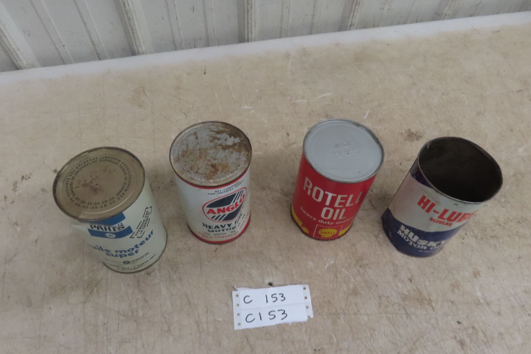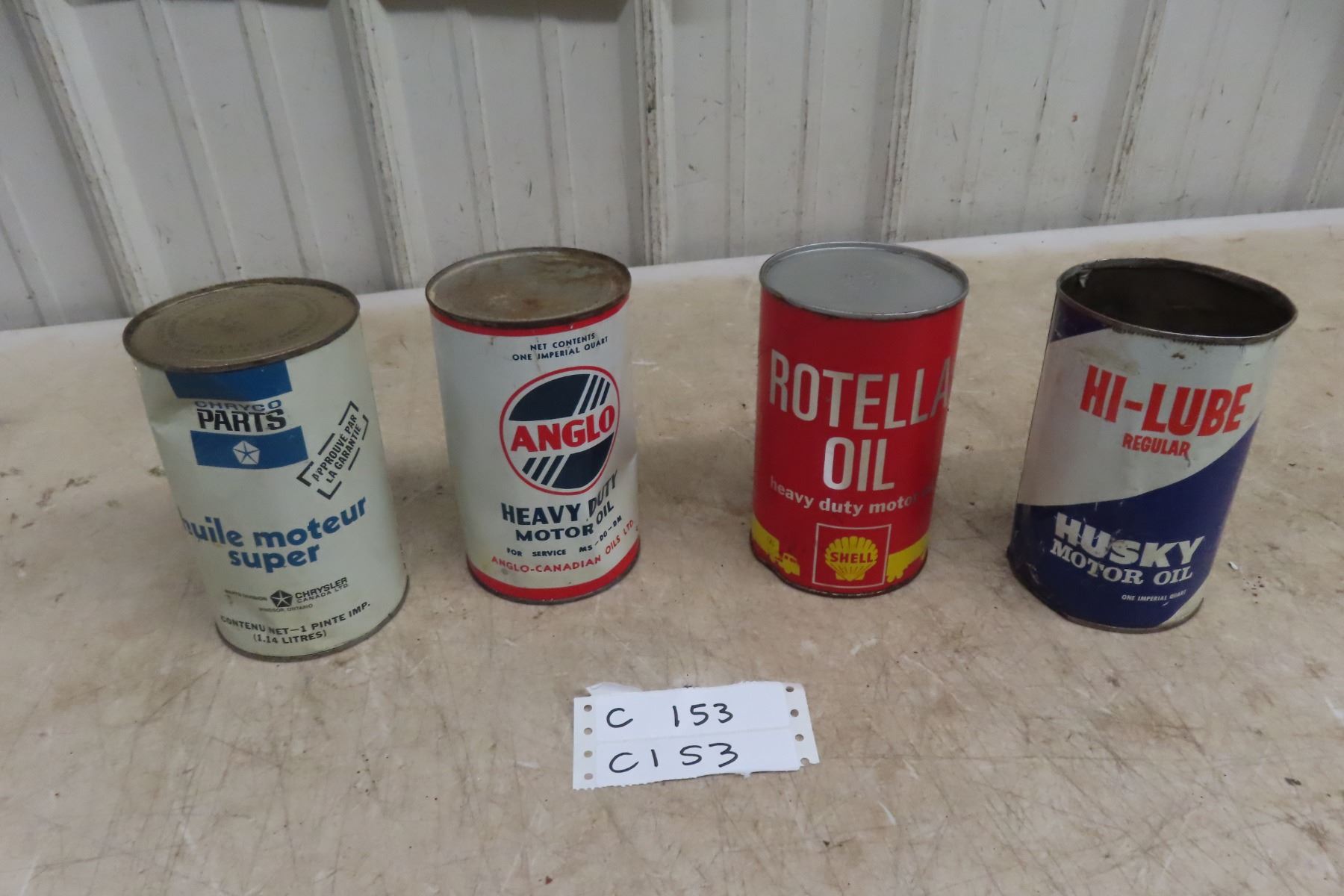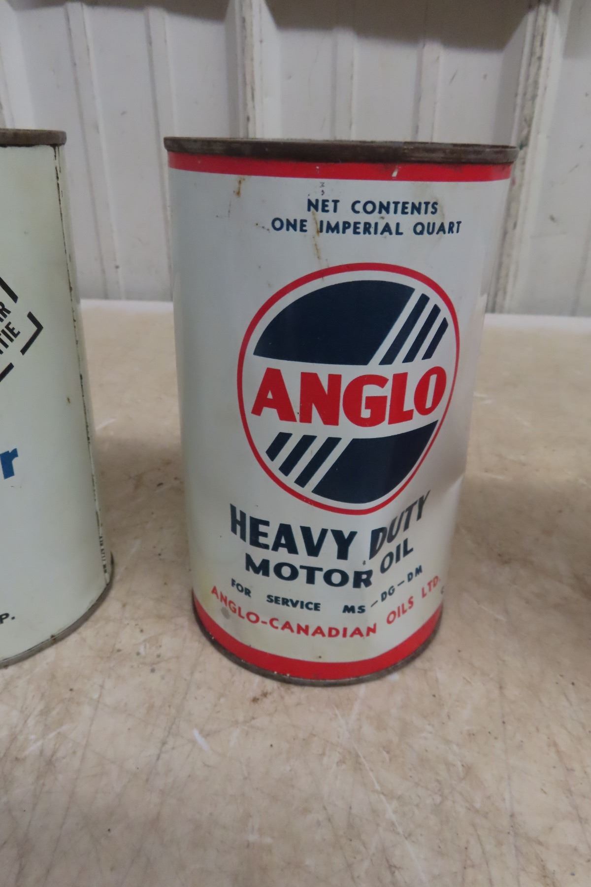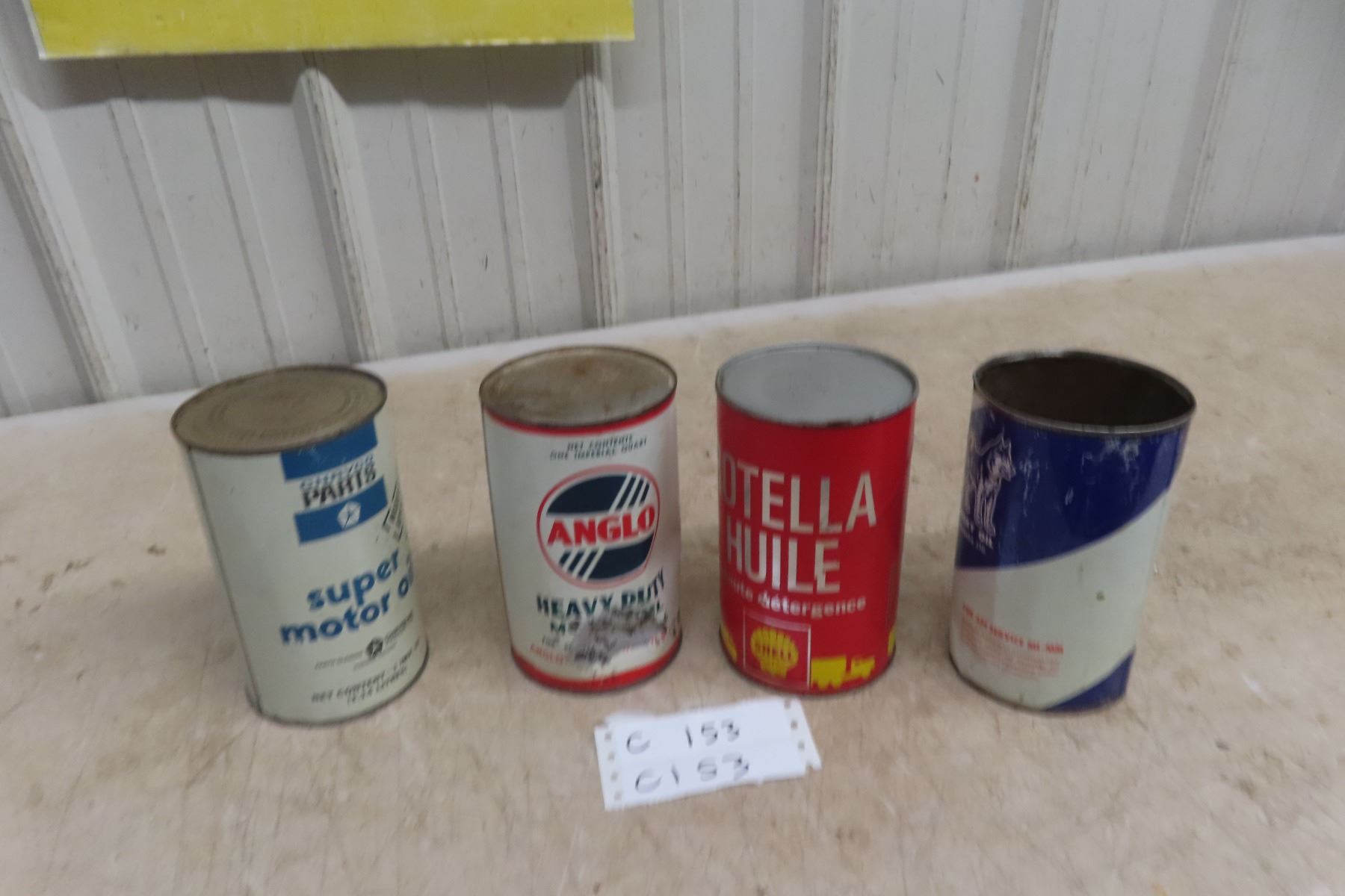 (4) Oil Quart Cans. (2) with Product. Anglo, Chryco, Shell, Husky.