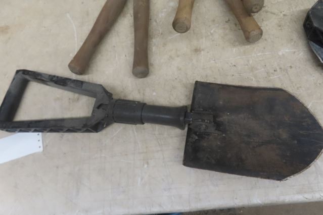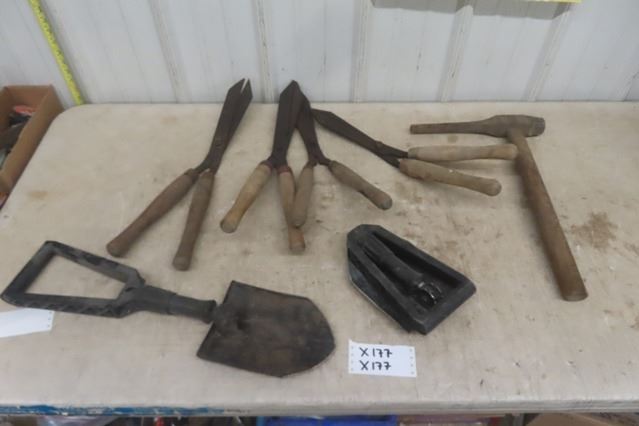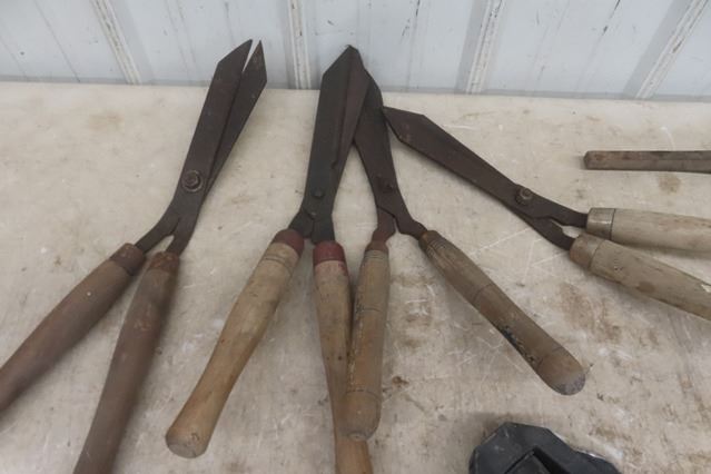 4 Pair of Hedge Trimmers, 2 Folding Shovels, Pick Hammer
