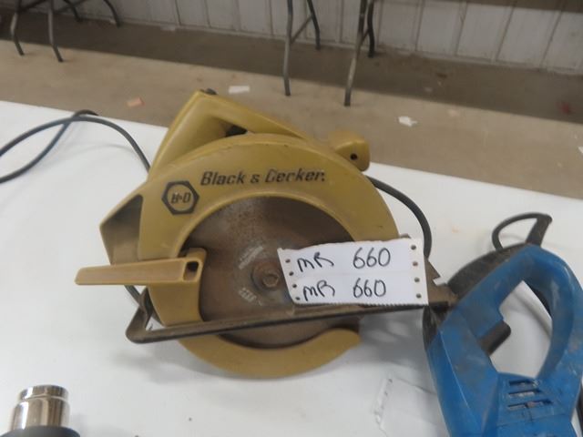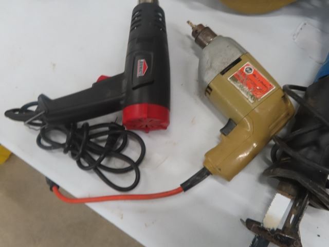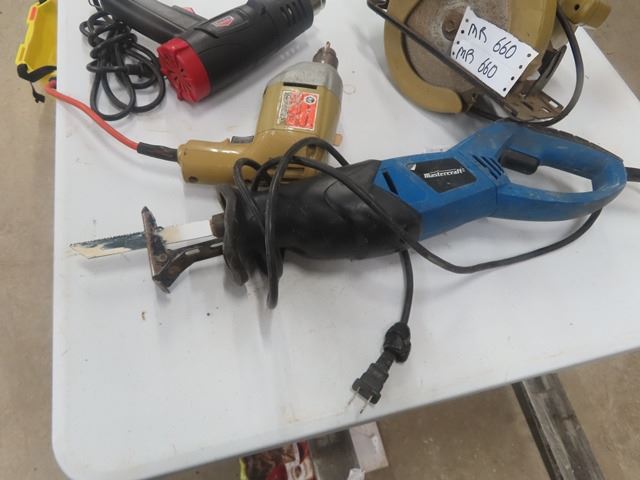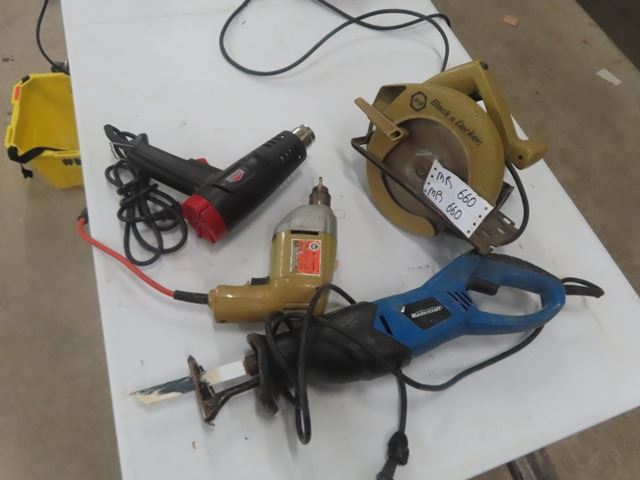 4 Power Tools ; B+D Circular Saw, Jobmate Heat Gun, B+D 3/8" Drill, Mastercraft Reciprocating Saw