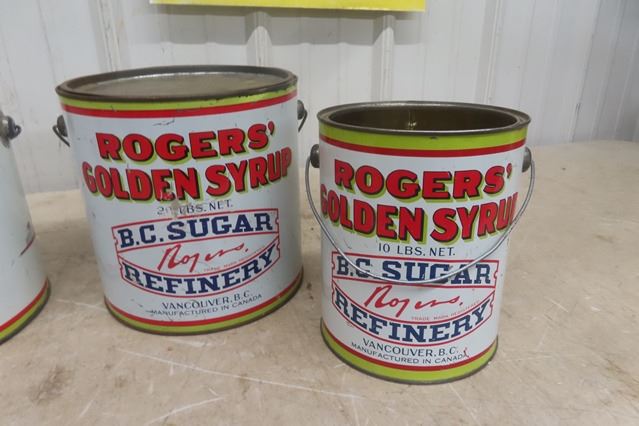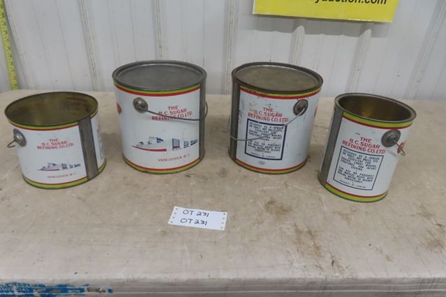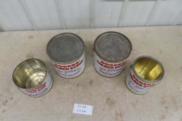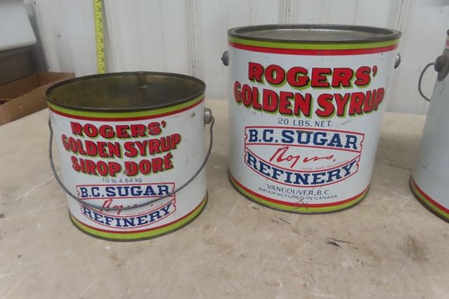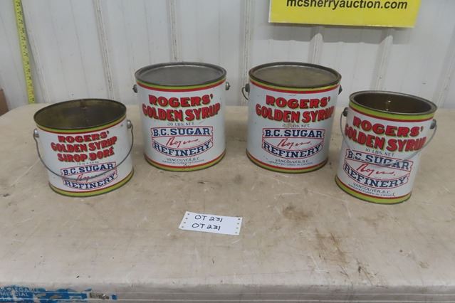 4 Rogers BC Sugar Golden Syrup Tin Cans - 2 20 Pound, 2 10 Pound , 2 with Lids, All Have Handles