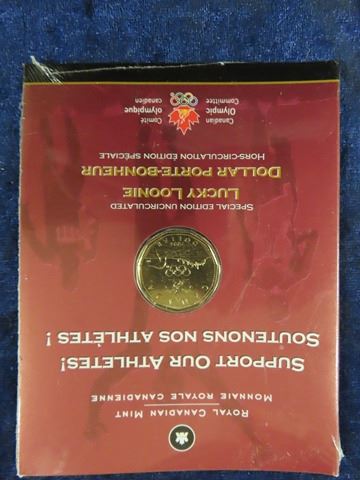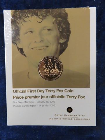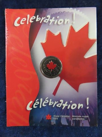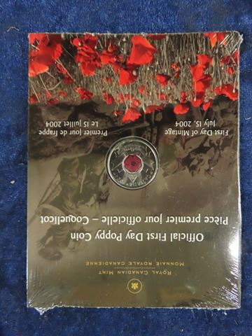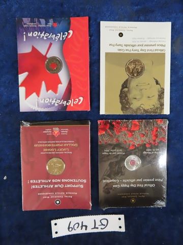 4 Sealed Collector Coins - Royal Canadian Mint ; 2004 Poppy Quarter 1st Day, 2004 Lucky Loonie, 2005 Terry Fox Loonie 1st Day, 2004 Celebrations 25 cent Colored Coin - All Sealed