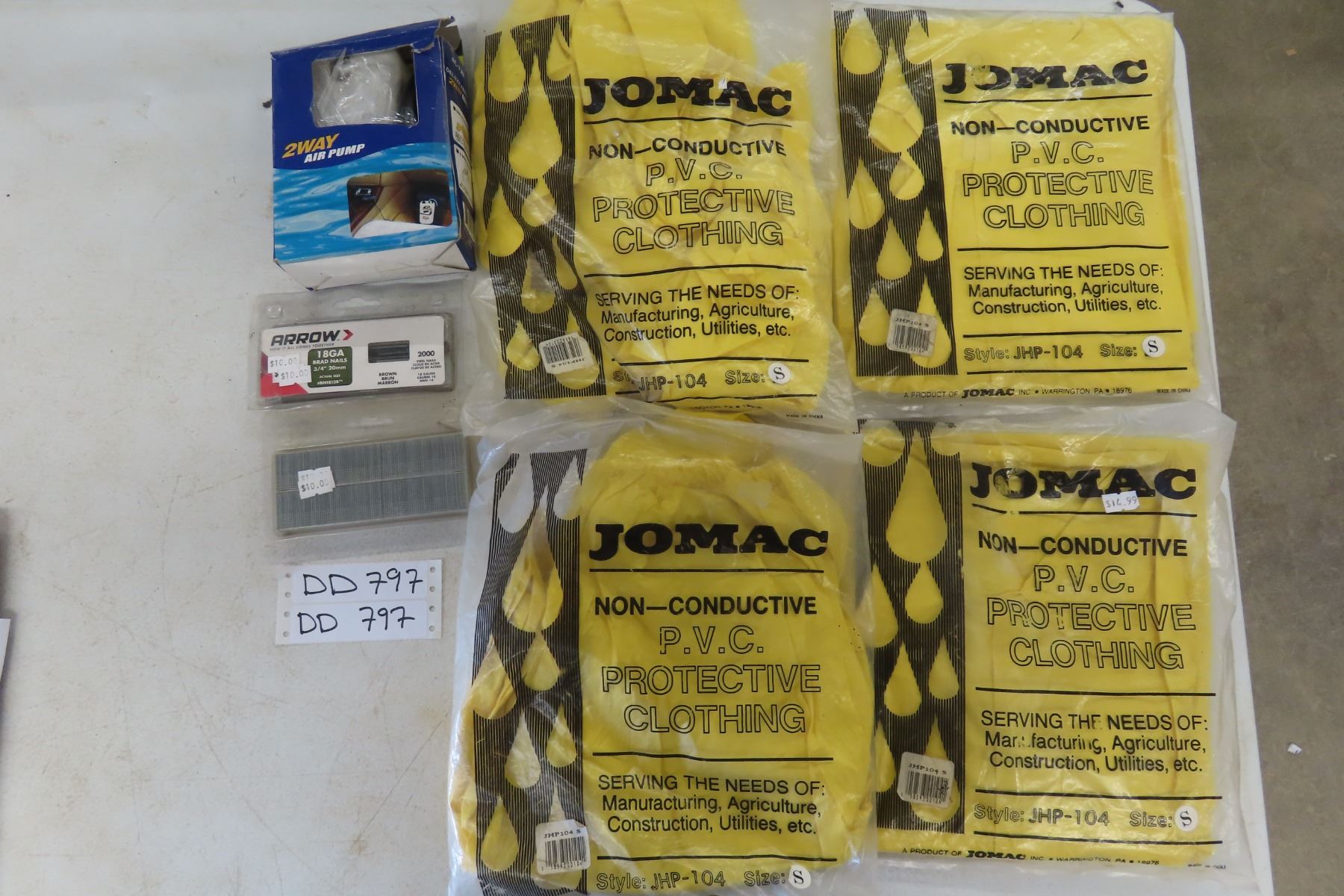 4 Sets of PVC Protective Clothing Sale Size, 2 Packs of Brad Nails and 12 Volt 2 Way Air Pump