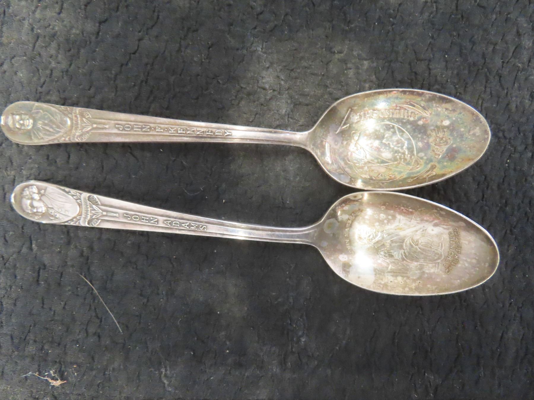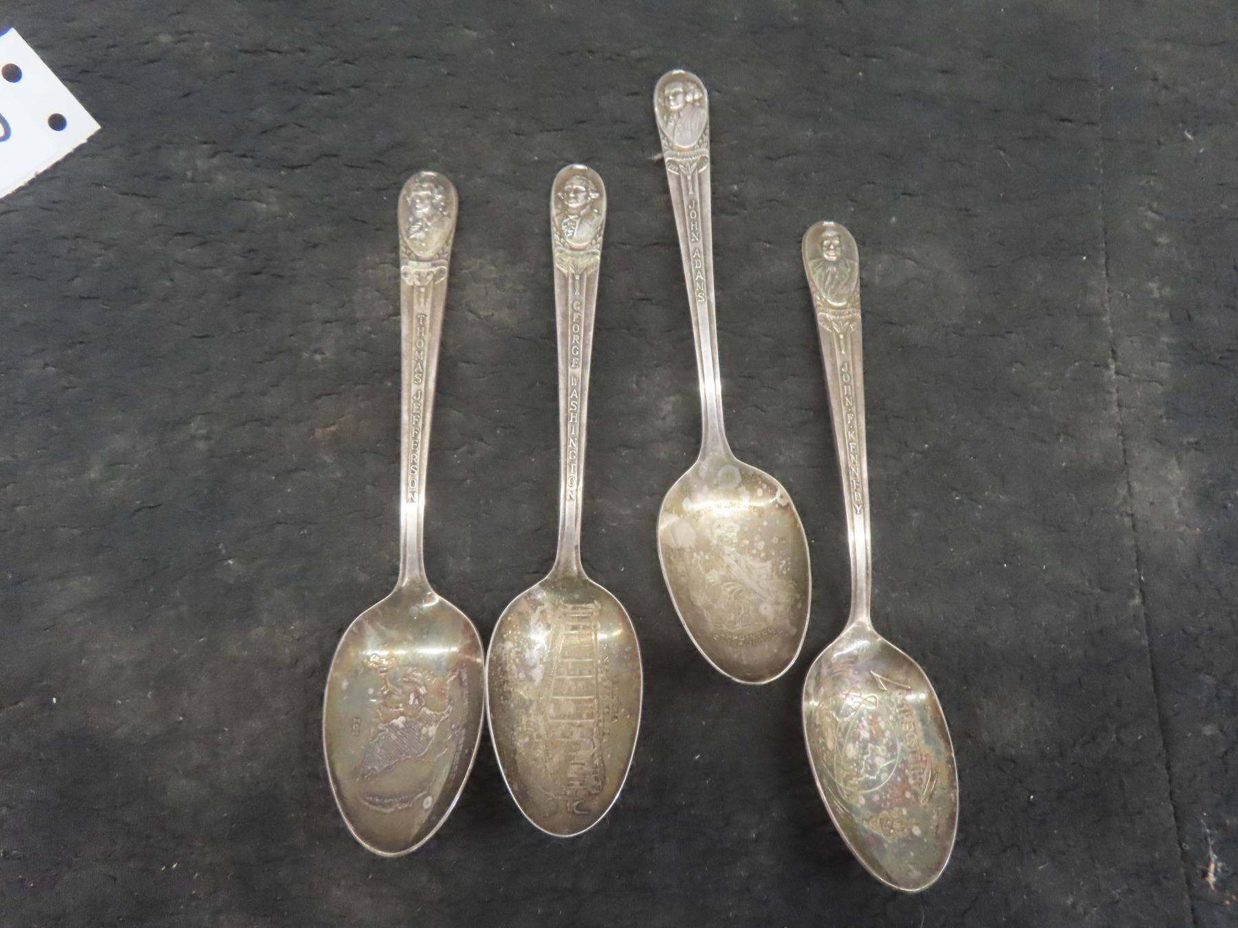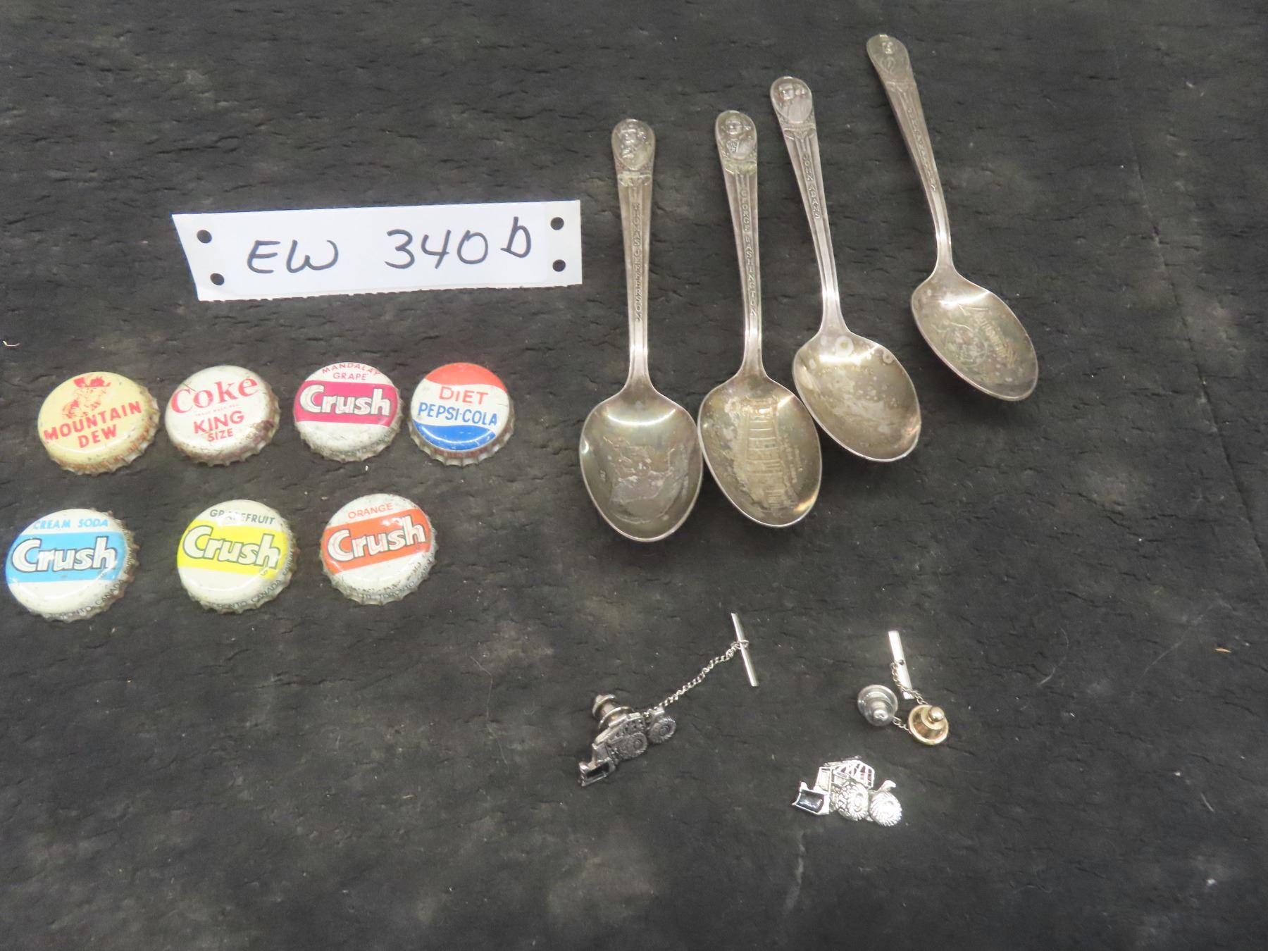 4 Silver Plated Commemorative Spoons JFK, George Washington, Thomas Jefferson, John Adams and 2 Tractor Tie Clips and 7 Bottle Caps