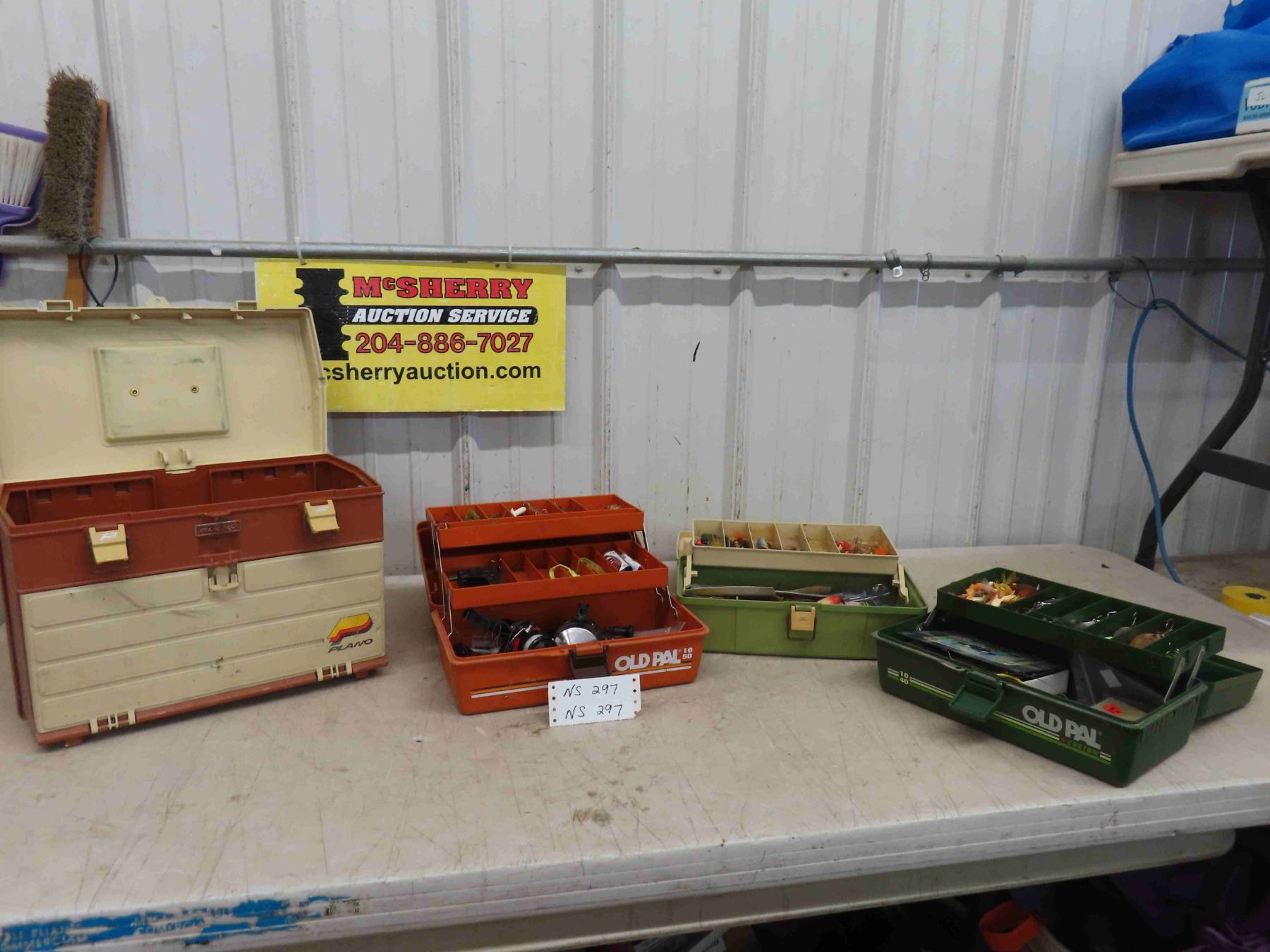 4 Tackle Boxes - 3 are Filled with Supplies: Reels, Lures, Scale, Hooks