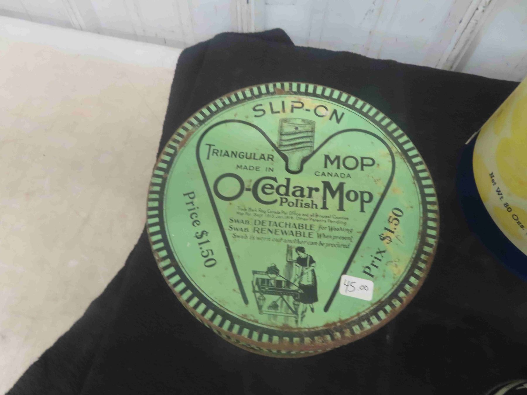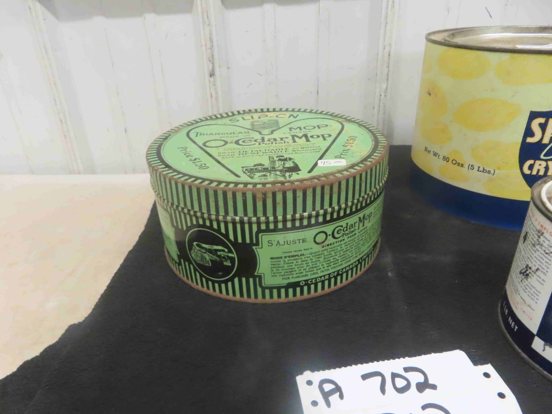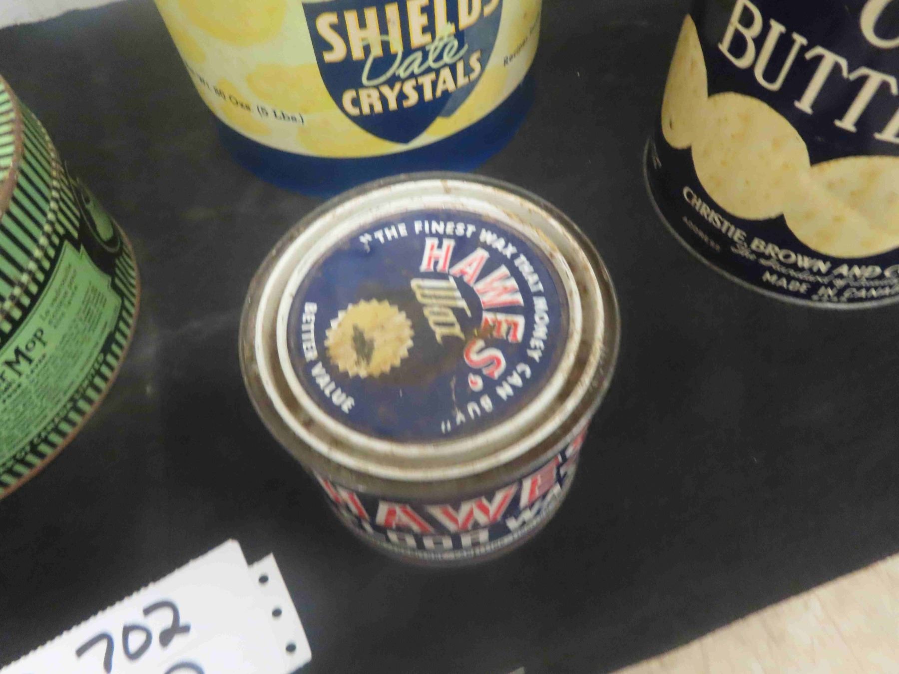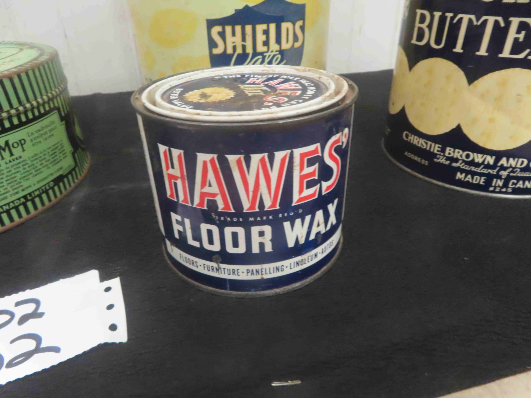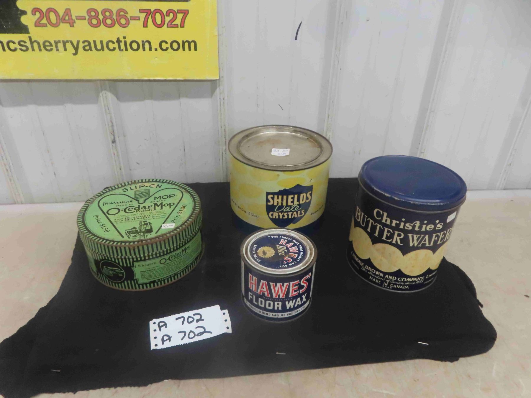 4 Tins ; O Cedar Mop Polish, Hawes Floor Wax, Christie Butter Wafer, Shield Date Crystal