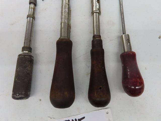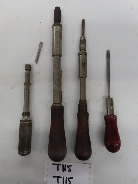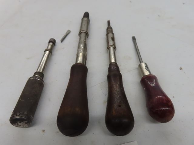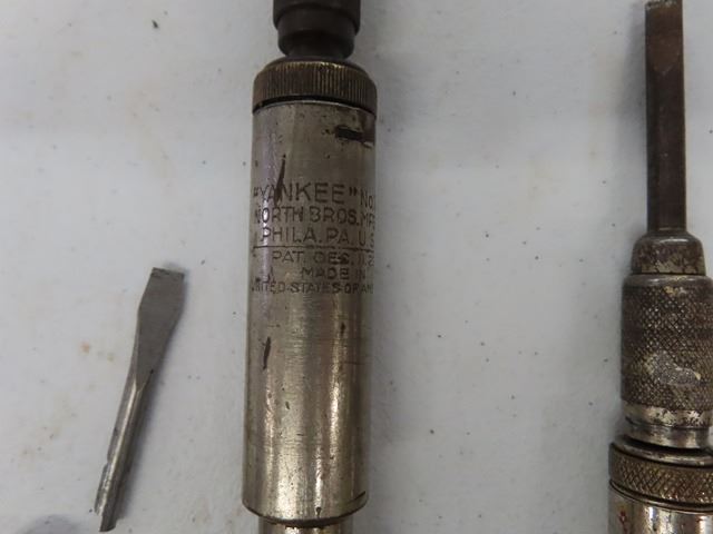 4 Vintage Antique Ratchet Screwdrivers; (1) Vintage 14" Stanley YANKEE No. 31A Spiral Ratchet Screwdriver Mfg. by North Bros. Patent Dec-11-23- works well + good condition + (2nd)Yankee spiral ratchet screwdriver No. 30, Manufactured by North Bros. It is 11” in length - patent dates of April-16-1896 and Oct-09-1900. It is ready to work or display + (3rd) is a Yankee No. 41 brass ratcheting screwdriver manufactured by North Bros. It is 7” in length. Patent Jan-25-1898 and Oct.-29-1901 - well used but ready to do more & screwdriver is an unknown maker but looks like a Stanley 10a- good condition.