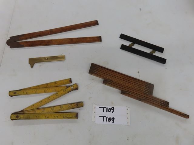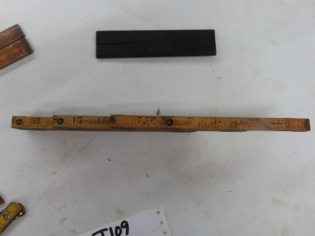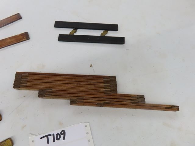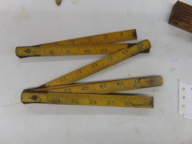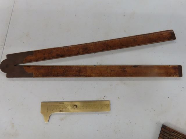 4 Vintage Antique Wooden Rulers plus a parallel rule; (1) Longest at 6” is a uniquely made rule that Pulls out rather than folding on the end of each section. It is an Interlox made by Master Rule Mfg. Co. -appears hardly used + (2nd) wooden rule is more traditional in that it folds and extends up to 40”- both metric + imperial. Although in very good condition - some rust under the folds - made in France + (3rd) rule made of brass and wood folds out to a length of 24”with brass extension in the center that allows total 3’- manufacture by J. Rabone and Sons, Birmingham England, ‘Warrand best Boxwood’ & (4th) is a small 4” caliper. It is solid brass rule with extension in the middle that can make it 8” in total length- No maker’s mark found- It appears brand new! Finally, there is a 6” parallel rule made of ebony and brass. It is so well made. One of those small tools you thought you would never part with.