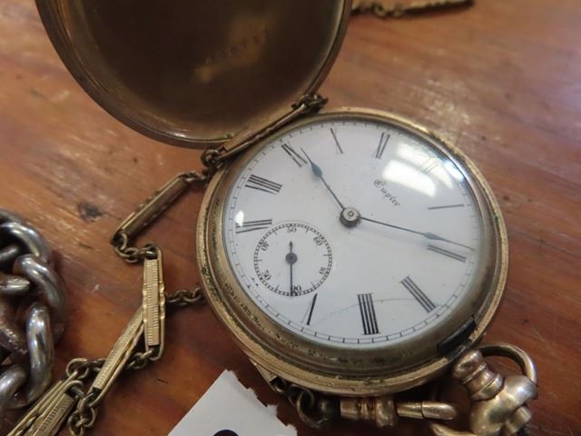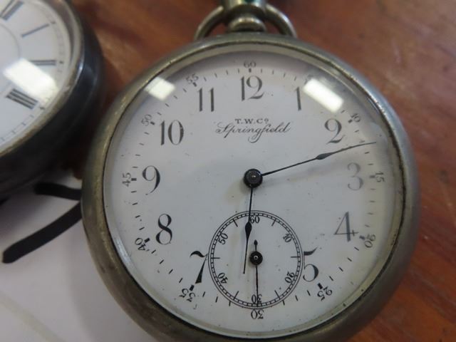 4 Vintage Pocket Watches; TW Company Springfield with Engraving of Iron Horse, Empire, Warrented Coin Silver 81 with Silver Case