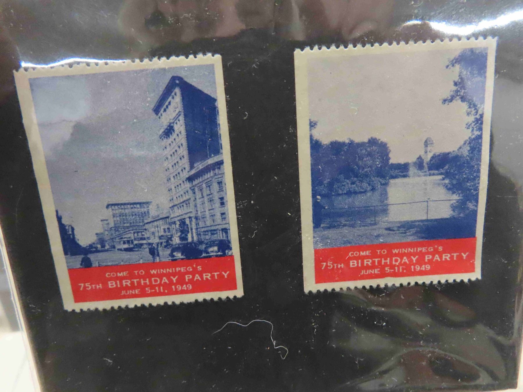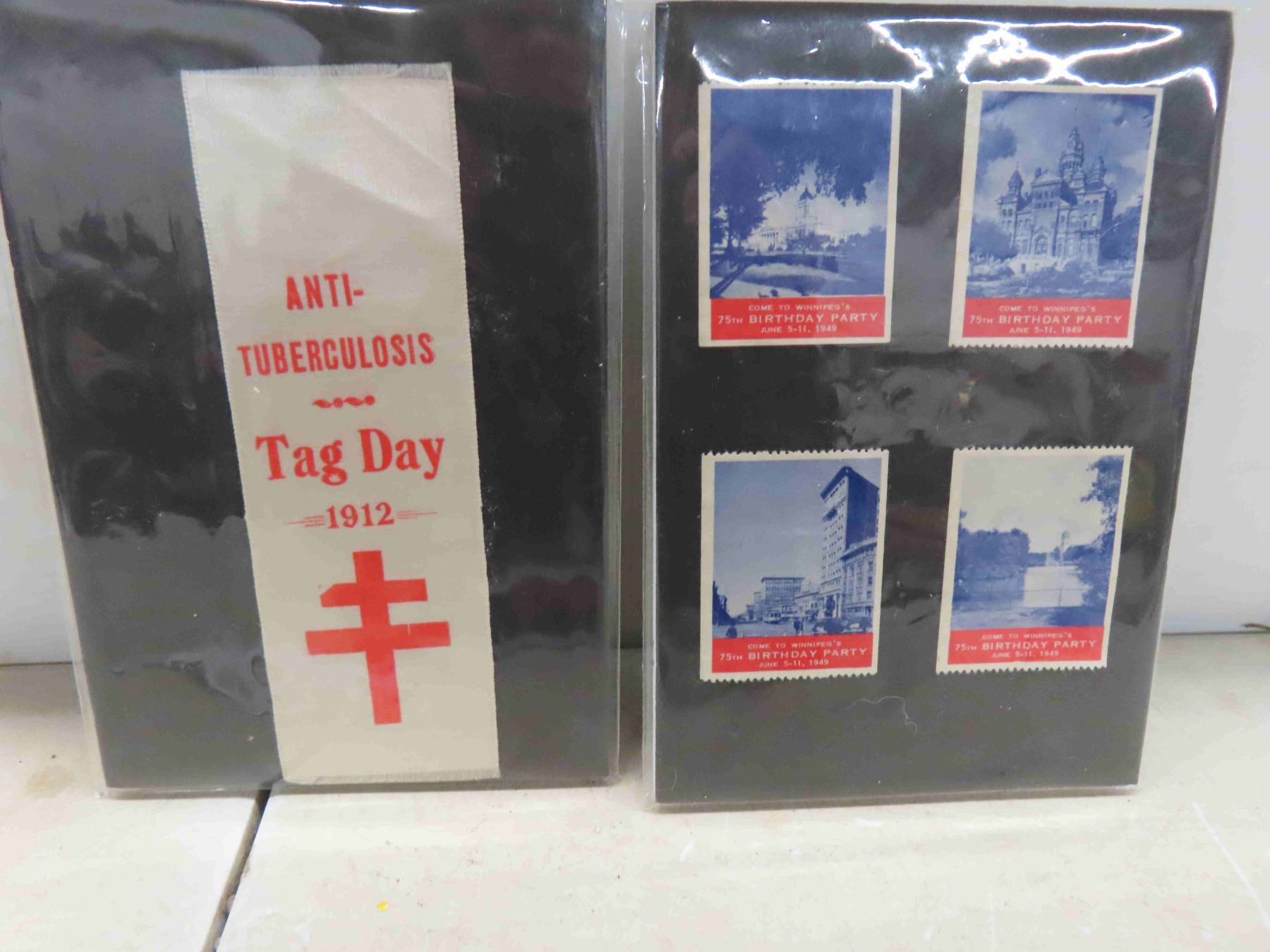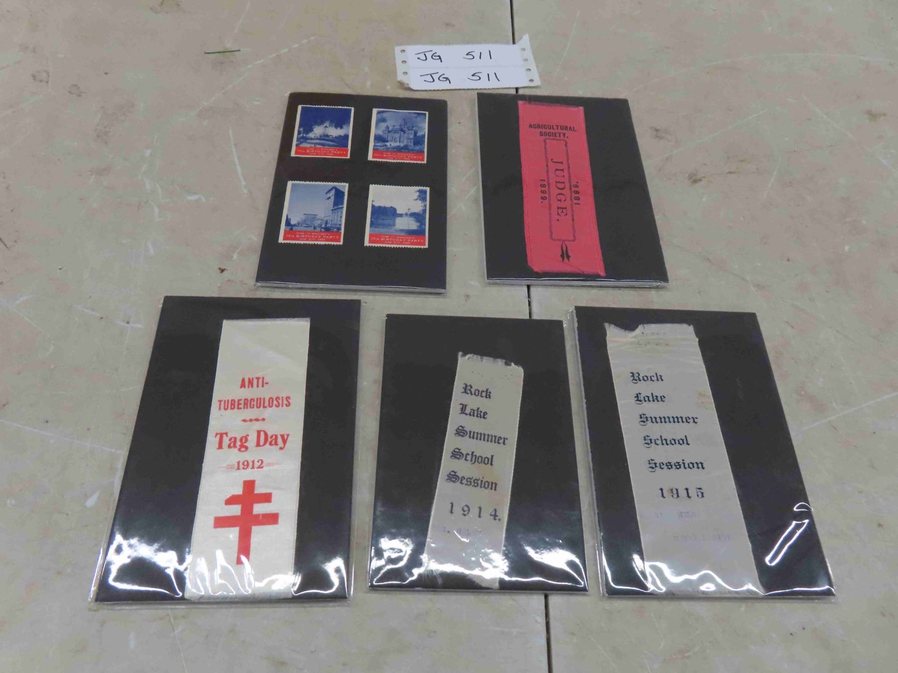 4 Vintage Ribbons : 1899 Agricultural Society , 1912 Anti Tuberculosis Tag Day 1912, 2 Rock Lake Grammar School Sessions 1914 + 1915 , 4 Stamps 'Come to Winnipegs 75th Birthday Party' 1949