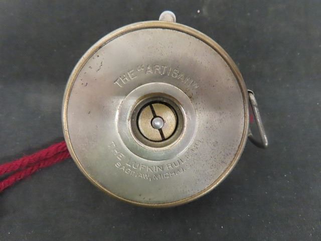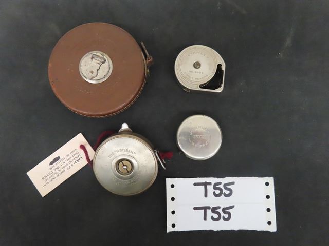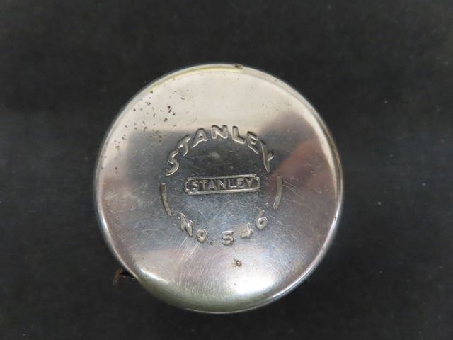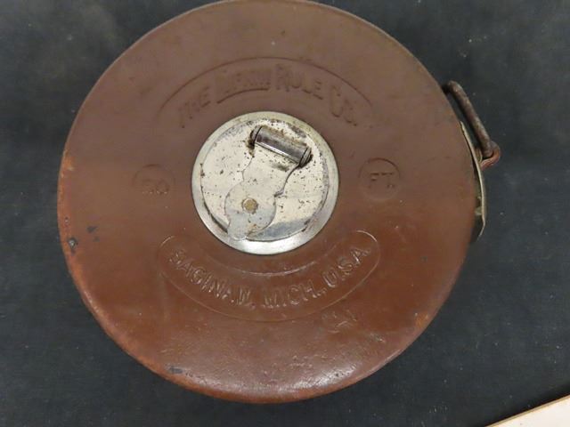 4 Vintage Tape Measures: Largest is a 50 ft. from Lufkin Rule Company of Barrie Ontario with cloth tape + (2nd) from Canada is a 6’ Mezurall made by the Lufkin Rule Co. of Windsor, Ontario No. 926. Pat No. Nov., 1932; July, 1925 and June, 1936 + (3rd) is a Defiance from Stanley named and automatic rule - 6’ and labeled No.1260 + (4th) WIZARD by the Lufkin Windsor Rule Co. of Windsor Ontario No. 686 - 6’ tape measure. Its patent is July 1935.