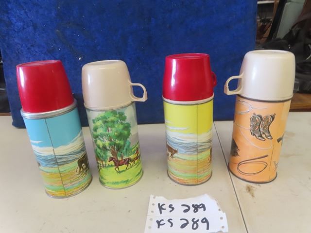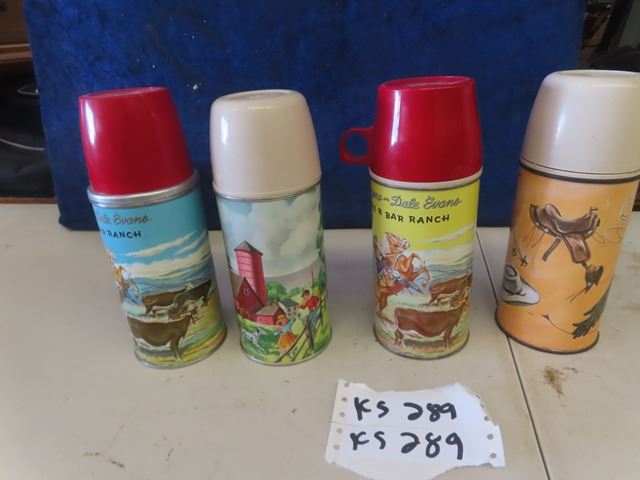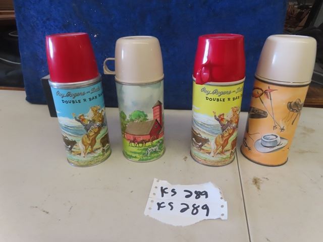 4 Vintage Thermos Mfg Thermos ; 2) Roy Rogers, 1) Western Theme, 1) Barn Yard Theme