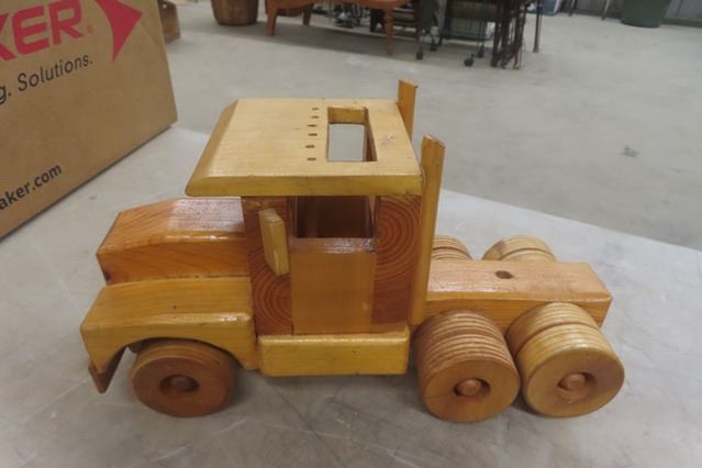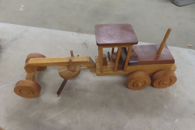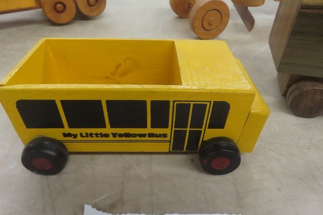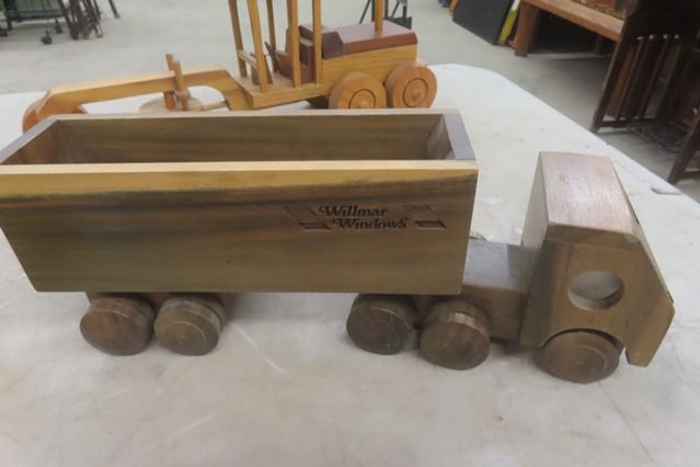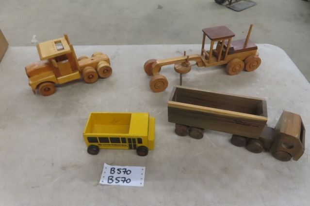 4 Wooden Toys: Semi Truck, Grader, Truck + Trailer, School Bus- Longest 17"