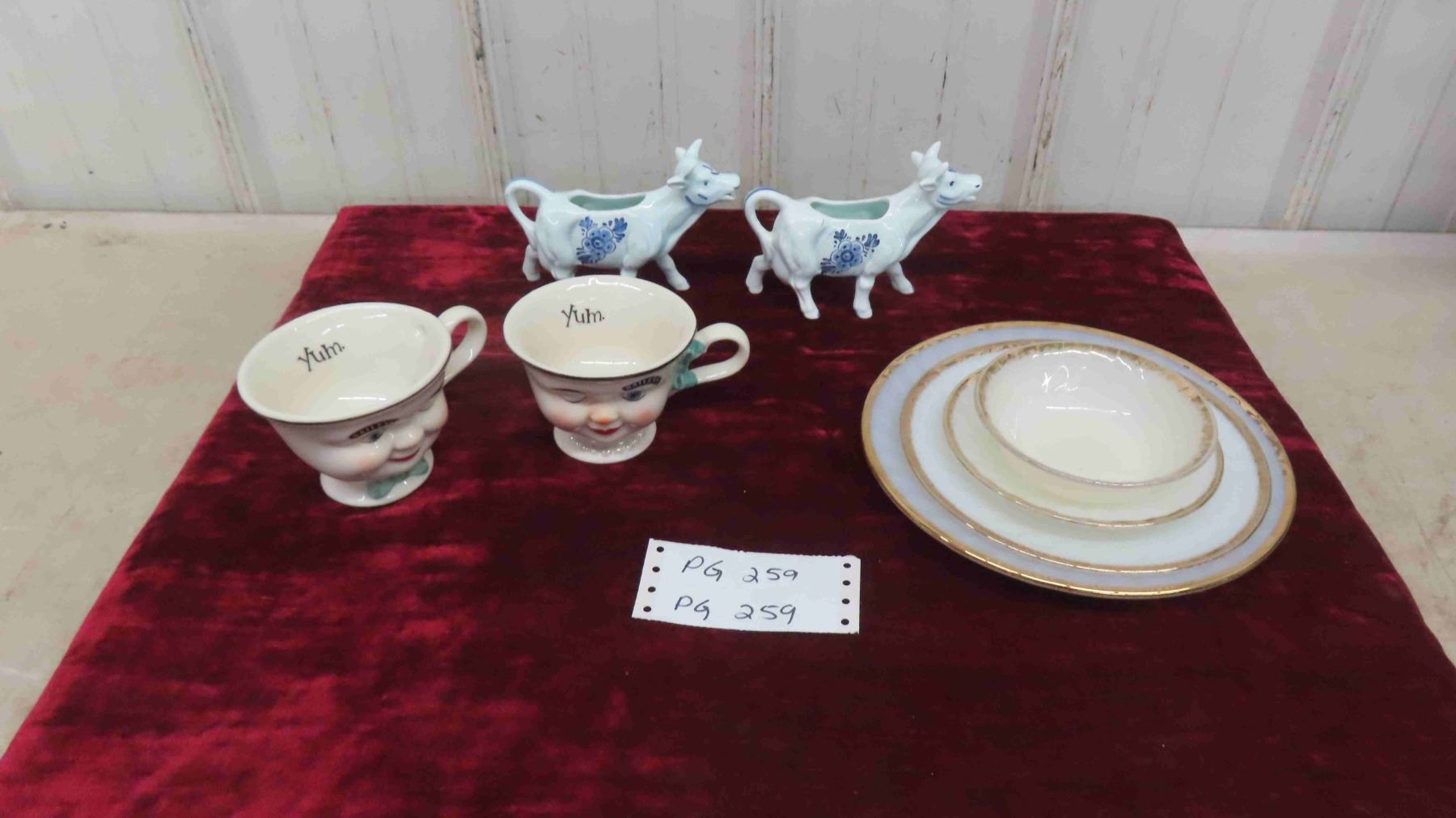 4 pc Fire King Milk Glass with Gold Rim ; Lady + Man , Baileys Irish Cream Matching Coffee Mugs Limited Edition Distillery Premier, 2 Cow Creamer Jugs