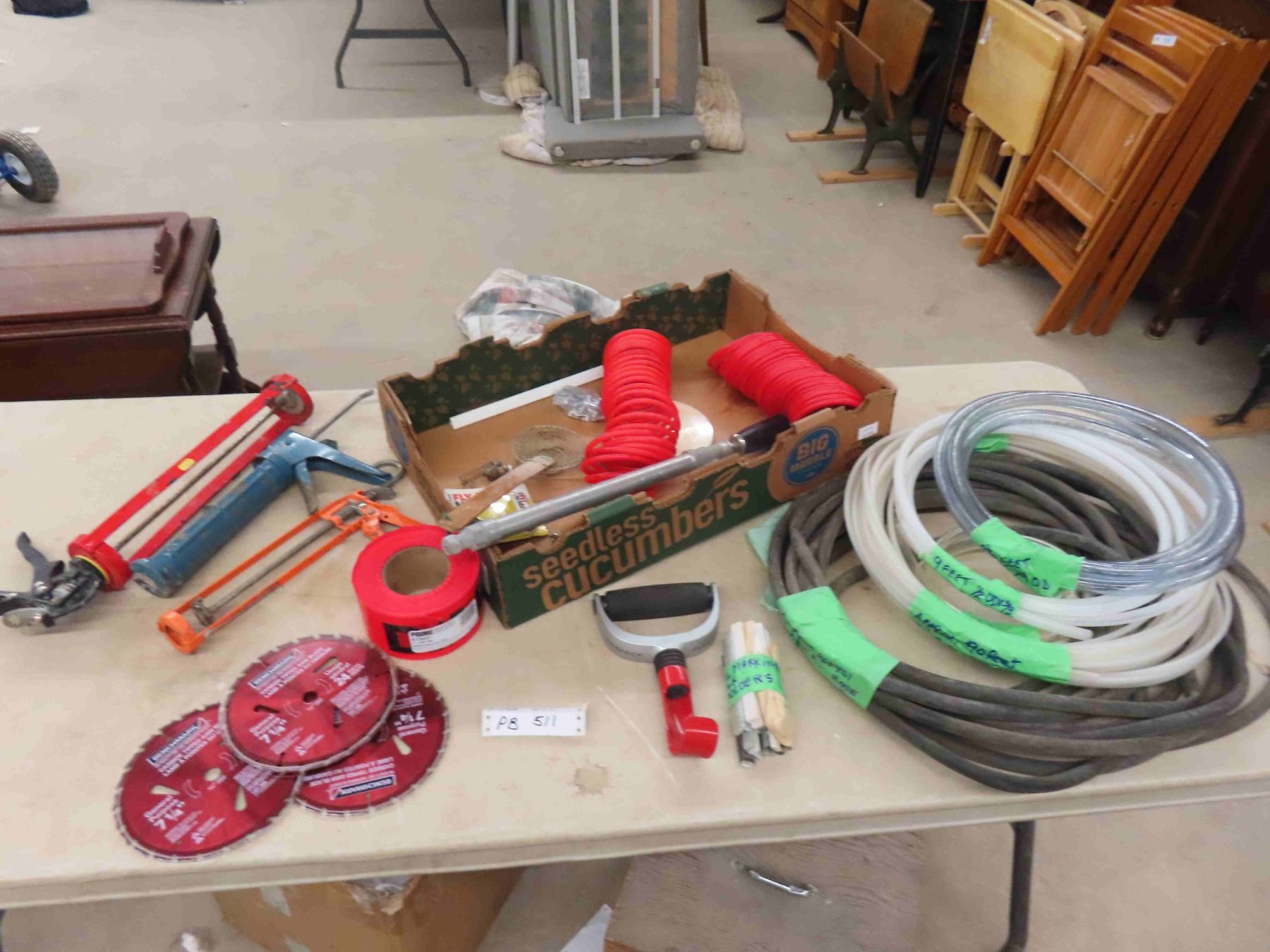 40ft 200 PSI Rubber Hose , 90ft 1/4'' Tubing , 3 New 7 1/4'' Saw Blades, Caulking Guns, New Danger Tape