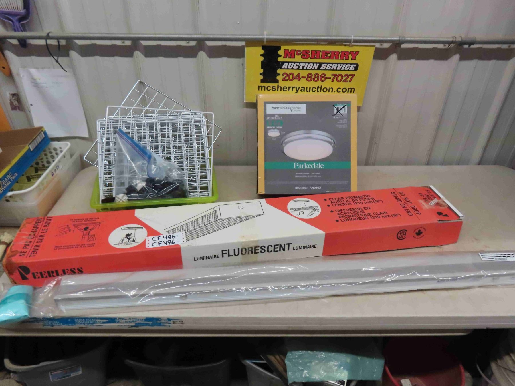 48" Fluorescent Light Fixture, New 58.5" x 80" Blind, Metal Wire Cube Rack in Parts, Parkdale Ceiling Fixture