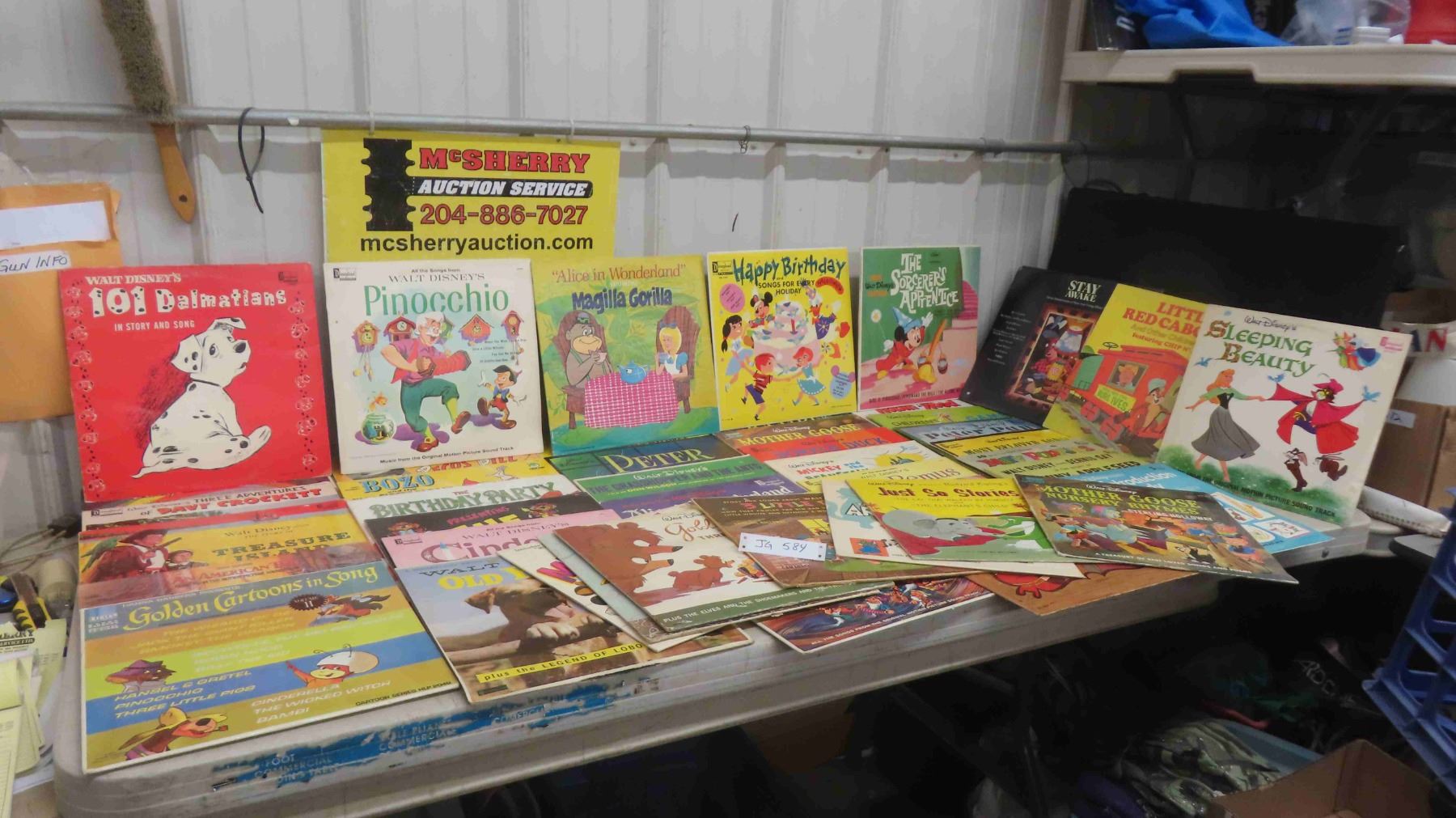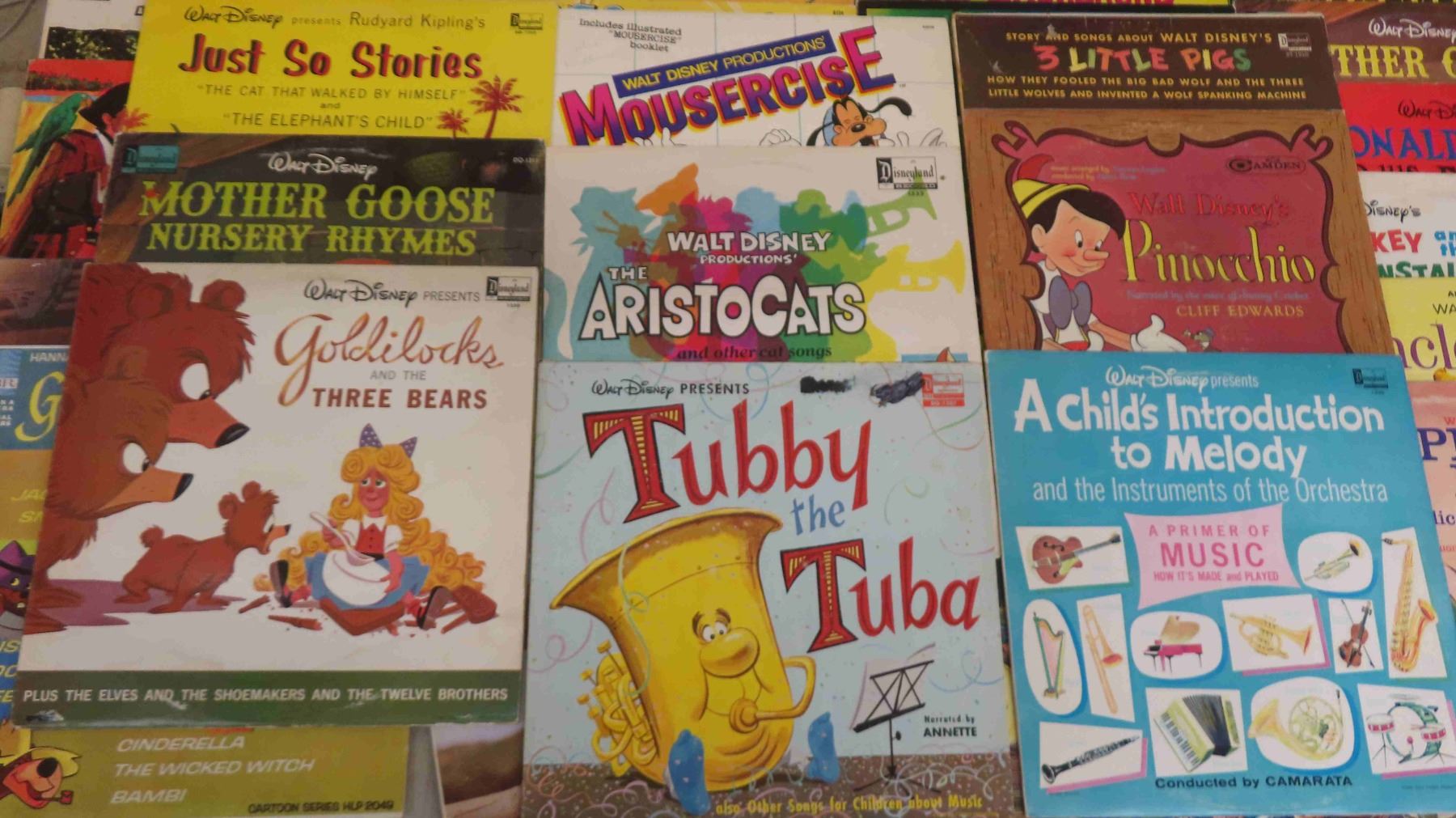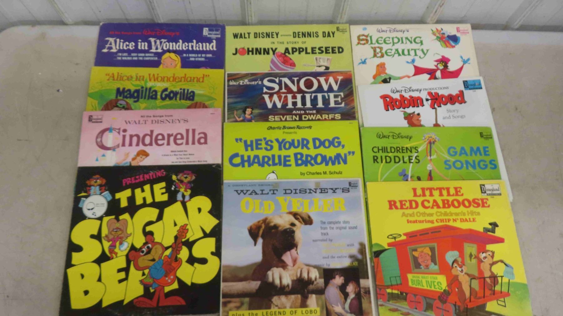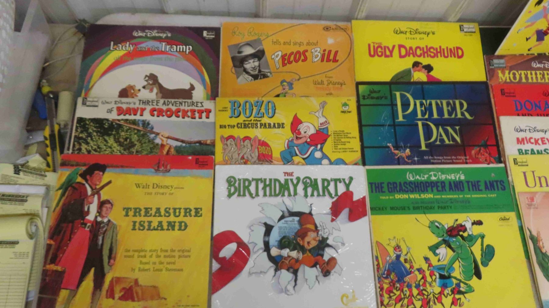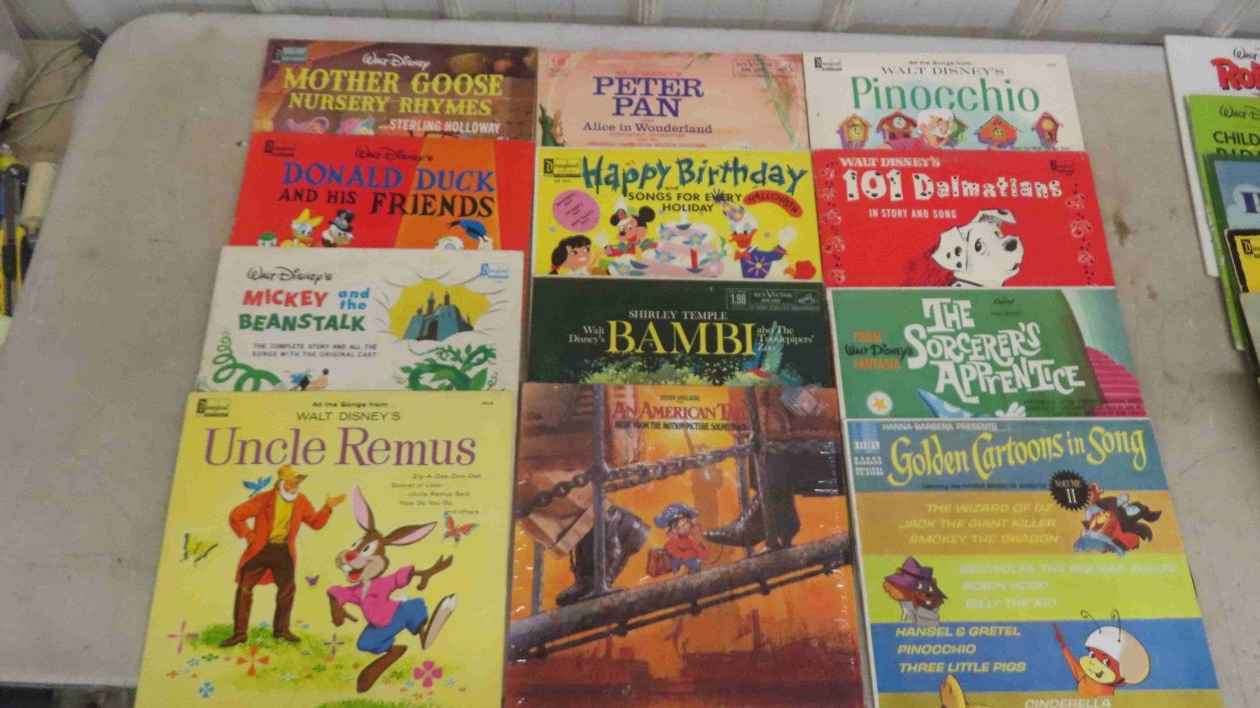 48 Walt Disney LP Record Albums 1960s-70s Including Hanna Barbera, American Tale, Charlie Brown, Bozo the Clown, Roy Rogers Sings about Pecos Bill