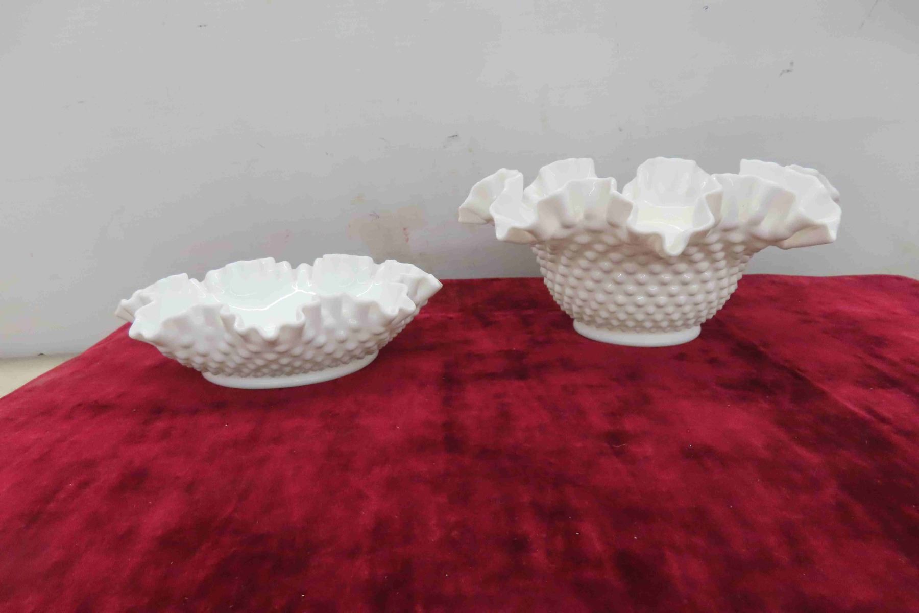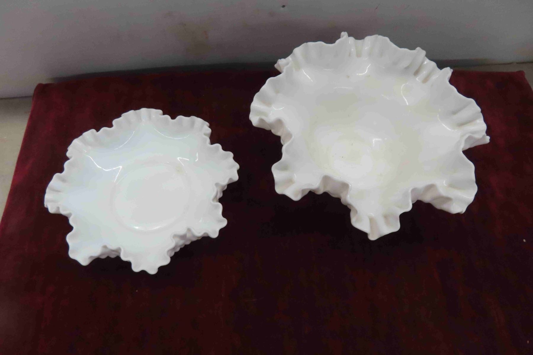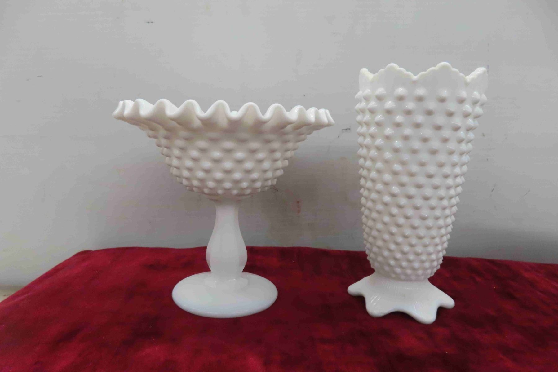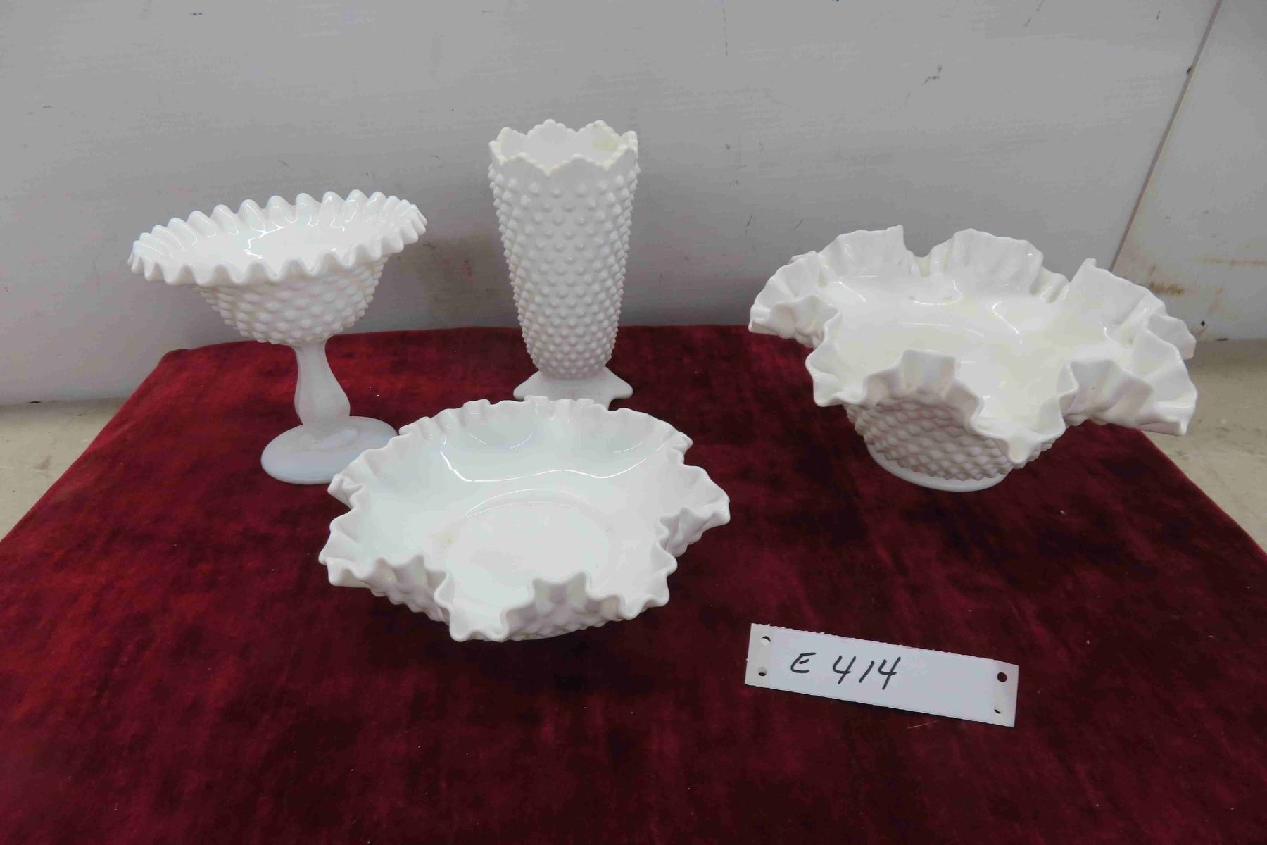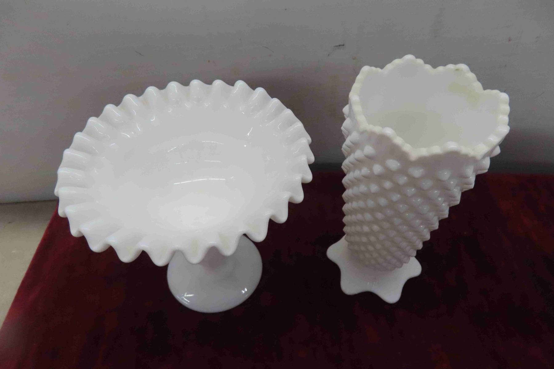 4pcs Milk Glass, Fenton Style Vase, Footed Candy Bowl & More