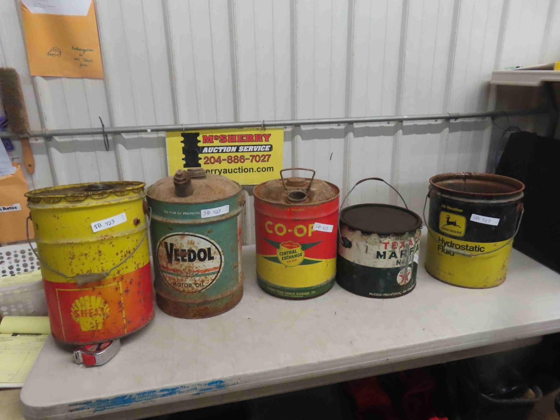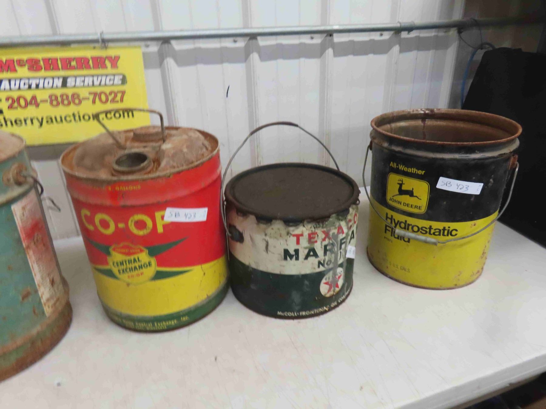 (5) 5 Gallon Oil / Grease Pails : John Deere, Texaco, Co op, Veedol, Shell