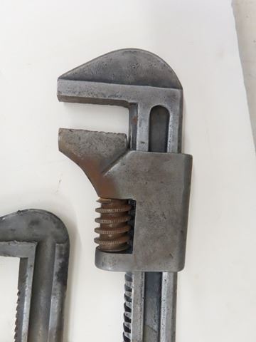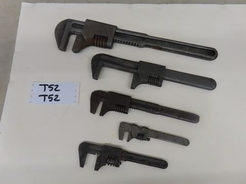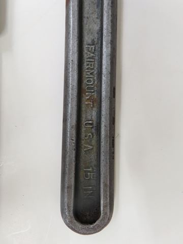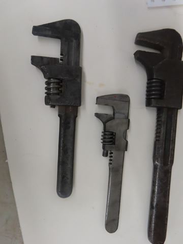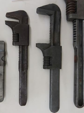 5 Antique Adjustable Wrenches (monkey wrenches); 14” is Fairmont, USA + 11” is made in Canada - unknown mark + 9” - no maker’s mark + 7” is J&S of UK & Smallest marked made in Germany.