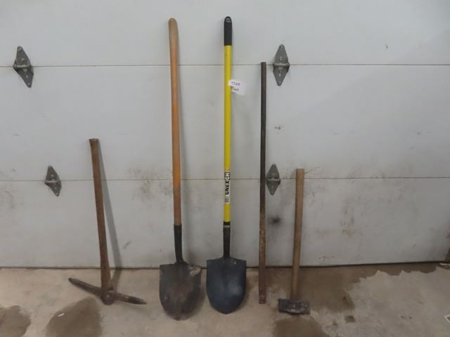 5 Assorted Yard Tools ; 2 Spades, Sledge Hammer, Prybar, Pick Axe