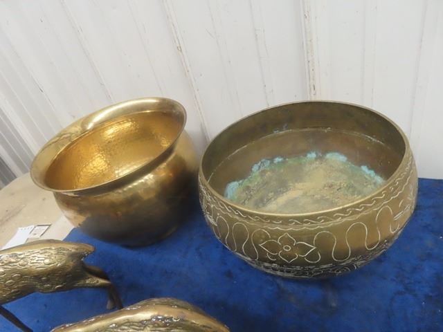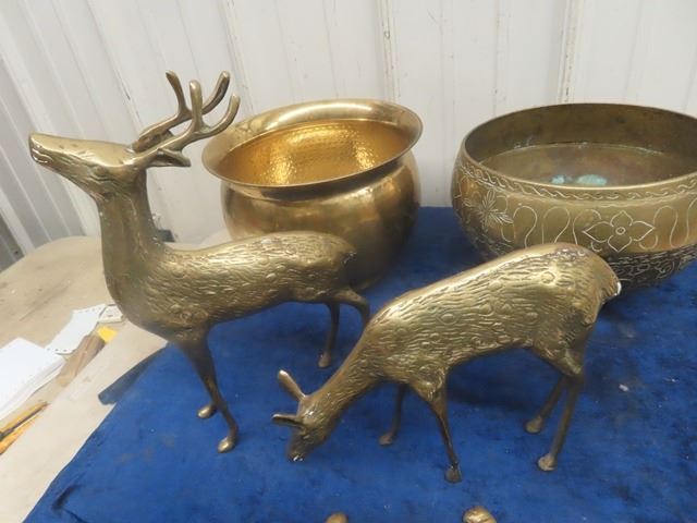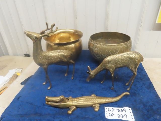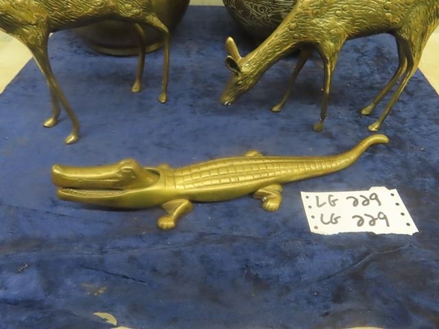 5 Brass Items - 2 Planters, 2 Deer Ornaments biggest 12" x 8" , 1 Crocodile Nut Cracker