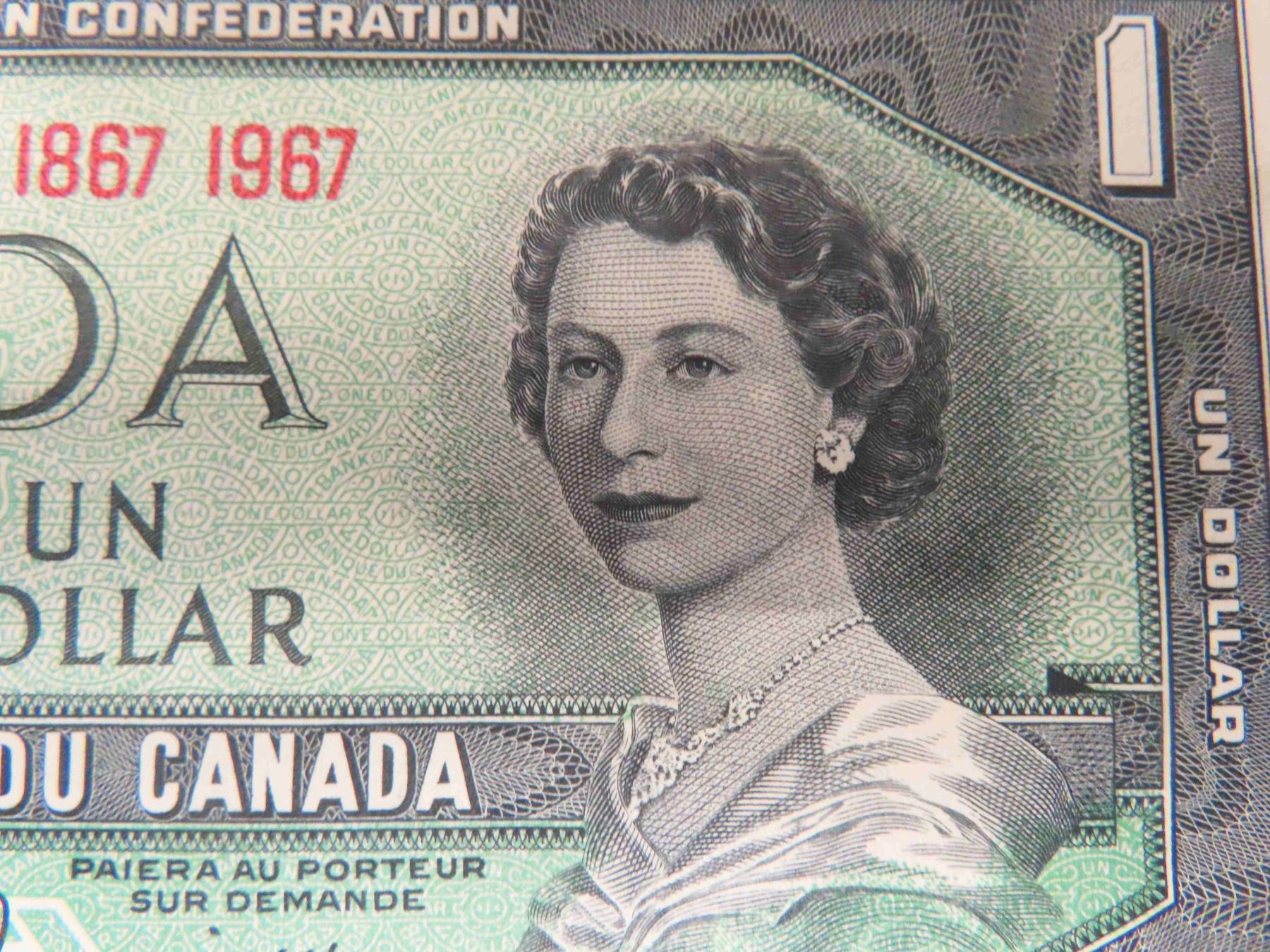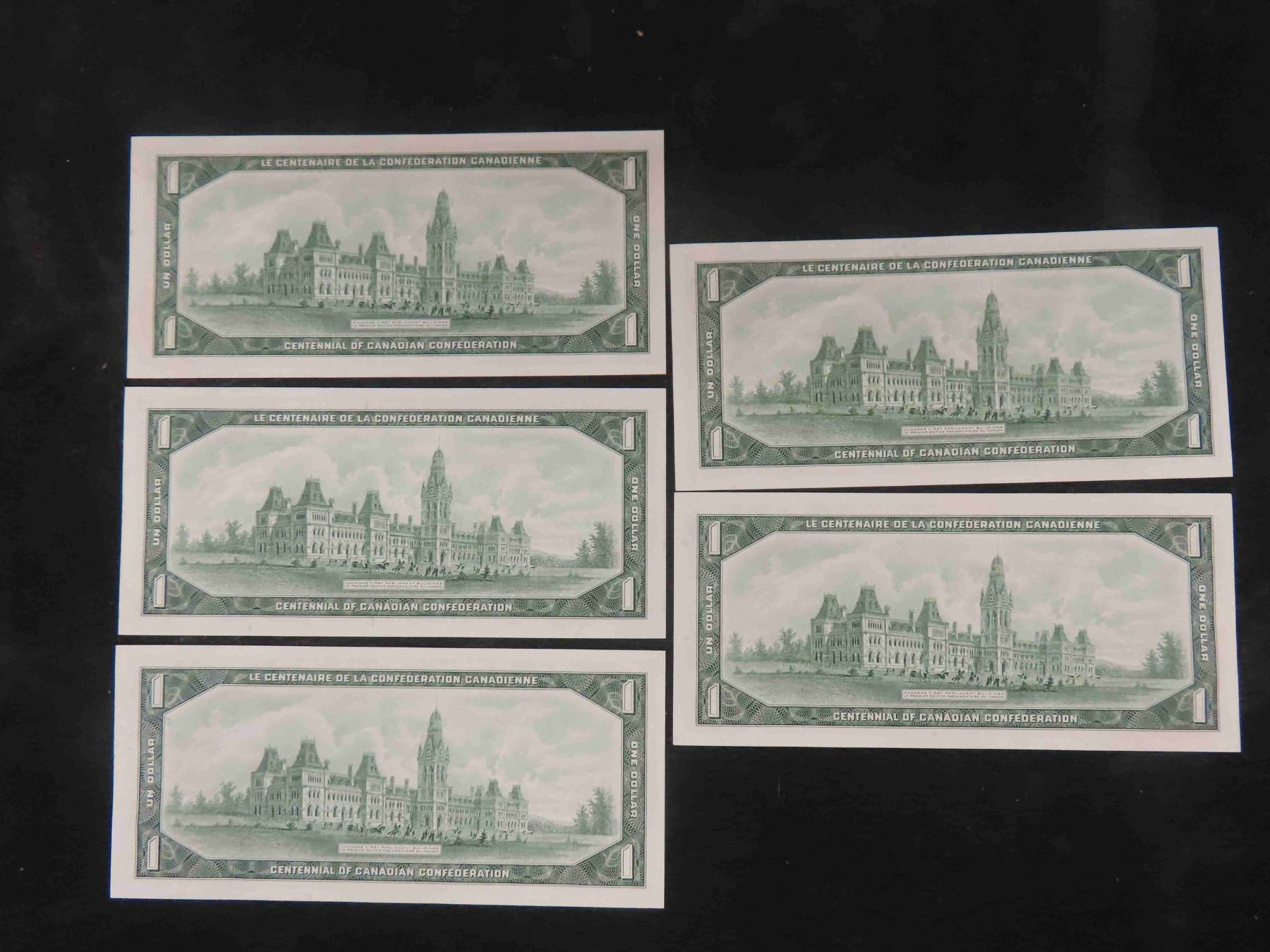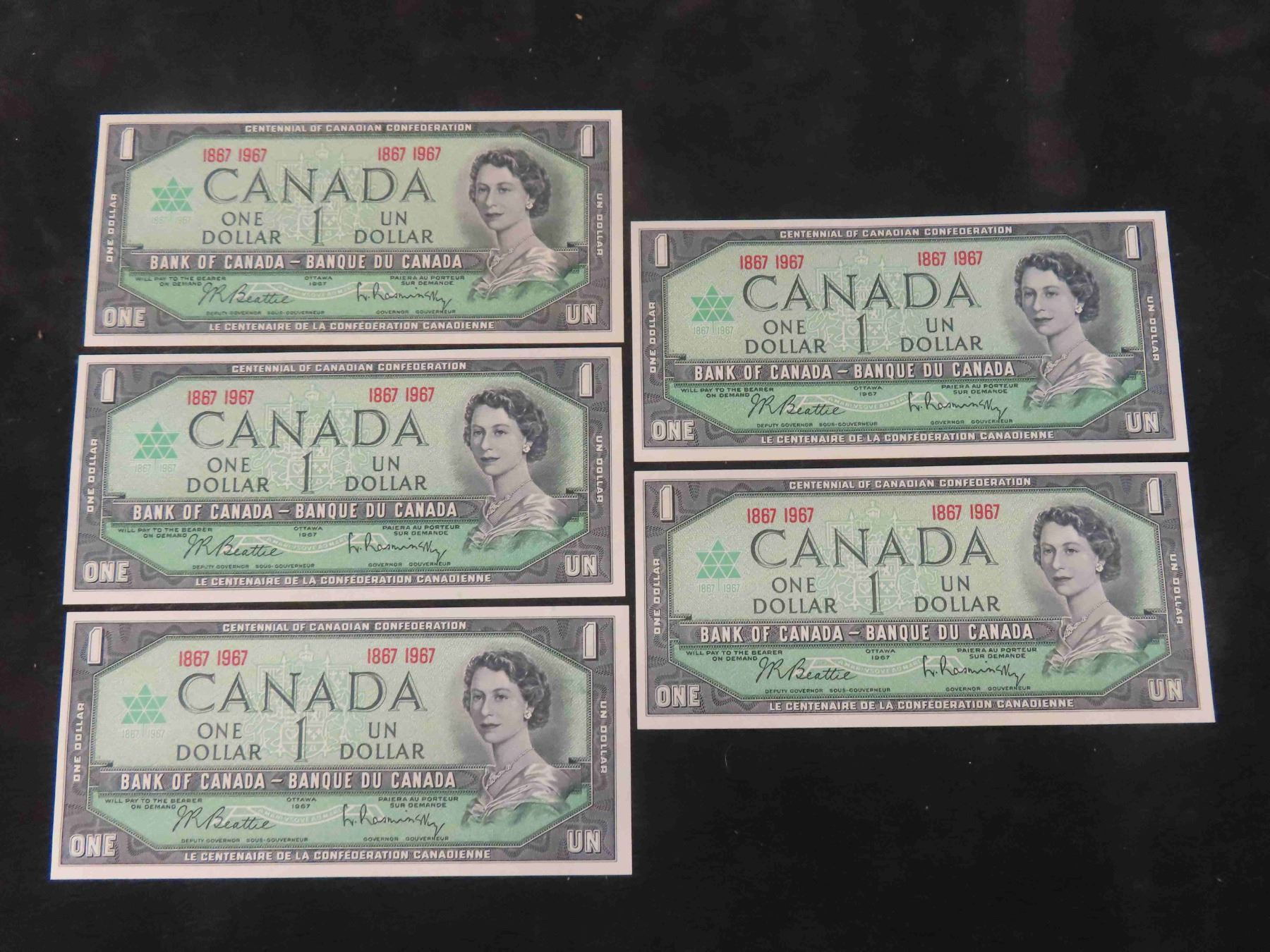 5 Canadain Crisp 1967 Centennial Dollar Bills