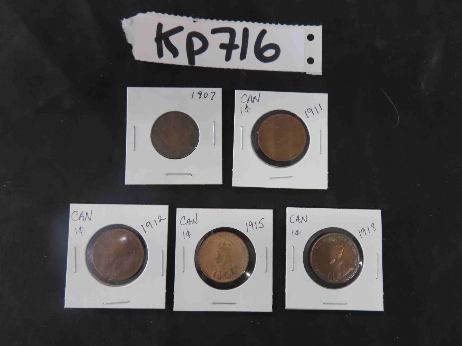 5 Canadian Large Pennies 1907, 1911, 1912, 1915, 1918