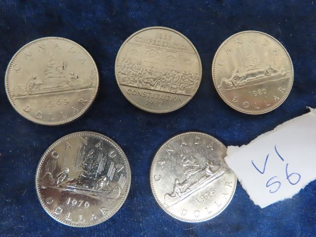 5 Canadian One Dollar Coins -1969, 1979, 1976, 1982 & 1980