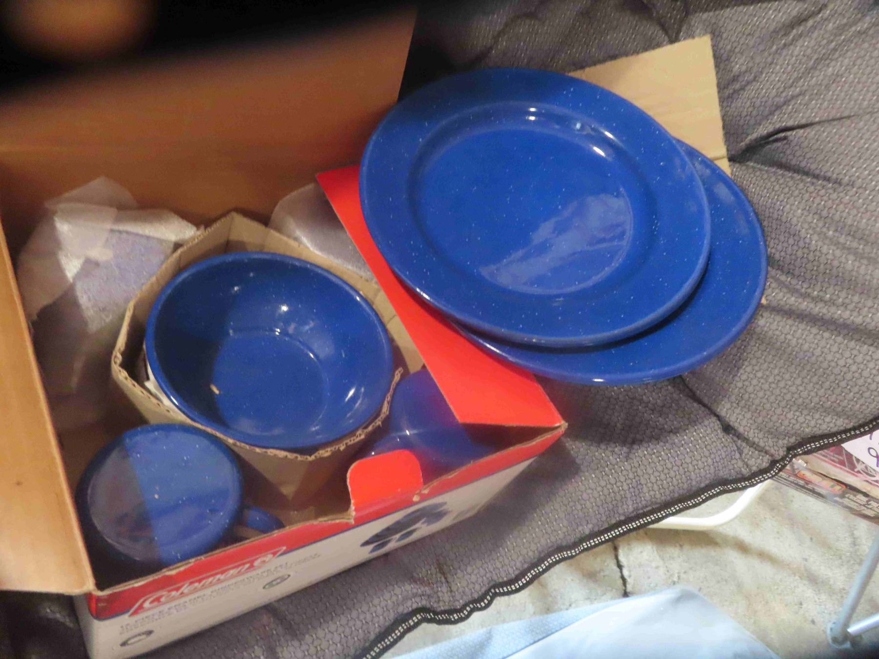 5 Folding Chairs, 12 Piece Coleman Enamel Camping Dish Set, EZ Grill