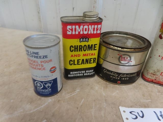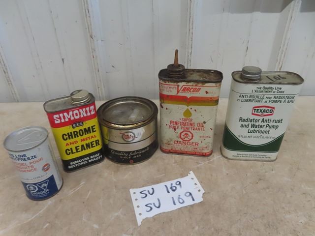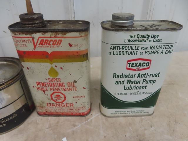 5 Garage Tins; Texaco Radiator Anti Rust, Varcon Penetrating Oil, Whiz Lubricant, Simoniz Chrome Cleaner, Gulf Anti Freeze