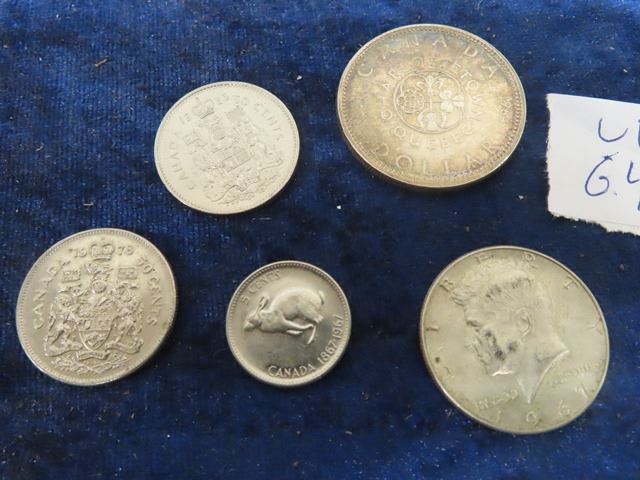 5 Items - 1964 Canadian $1 Coin, 1985 Cdn 50 Cent Coin, 1978 Cdn 50 Cent Coin, 1967 Cdn 5 Cent Centennial, 1967 USA 50 Cent Coin