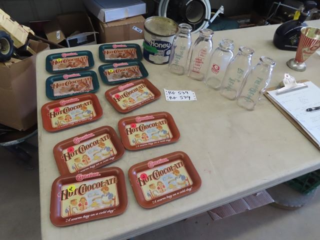 5 Labelled Milk Bottles, Honey Tin, Kelner Brothers Wpg Beach, & 10 Carnation Trays
