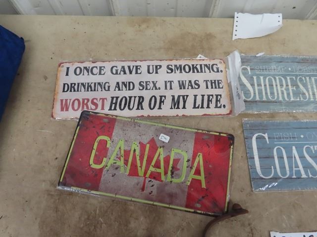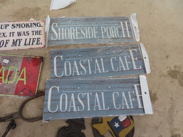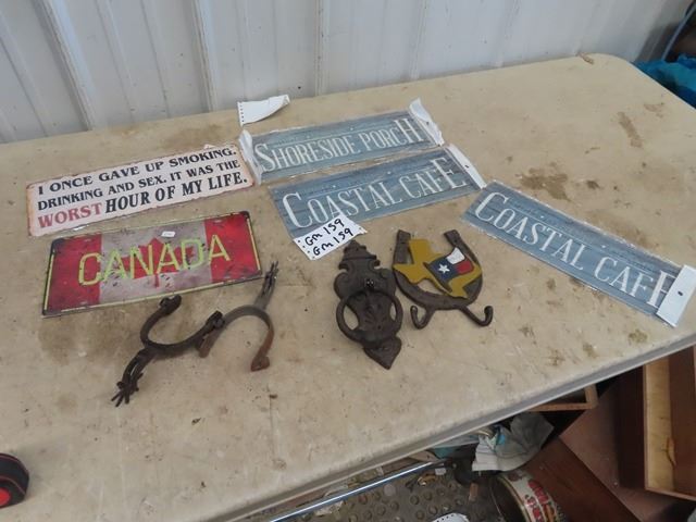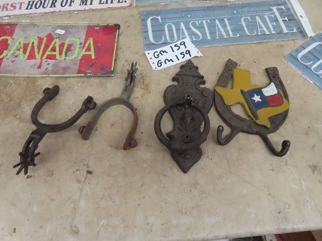 5 Metal Signs , 4 Cast Decorative Items, Door Knockers, and more